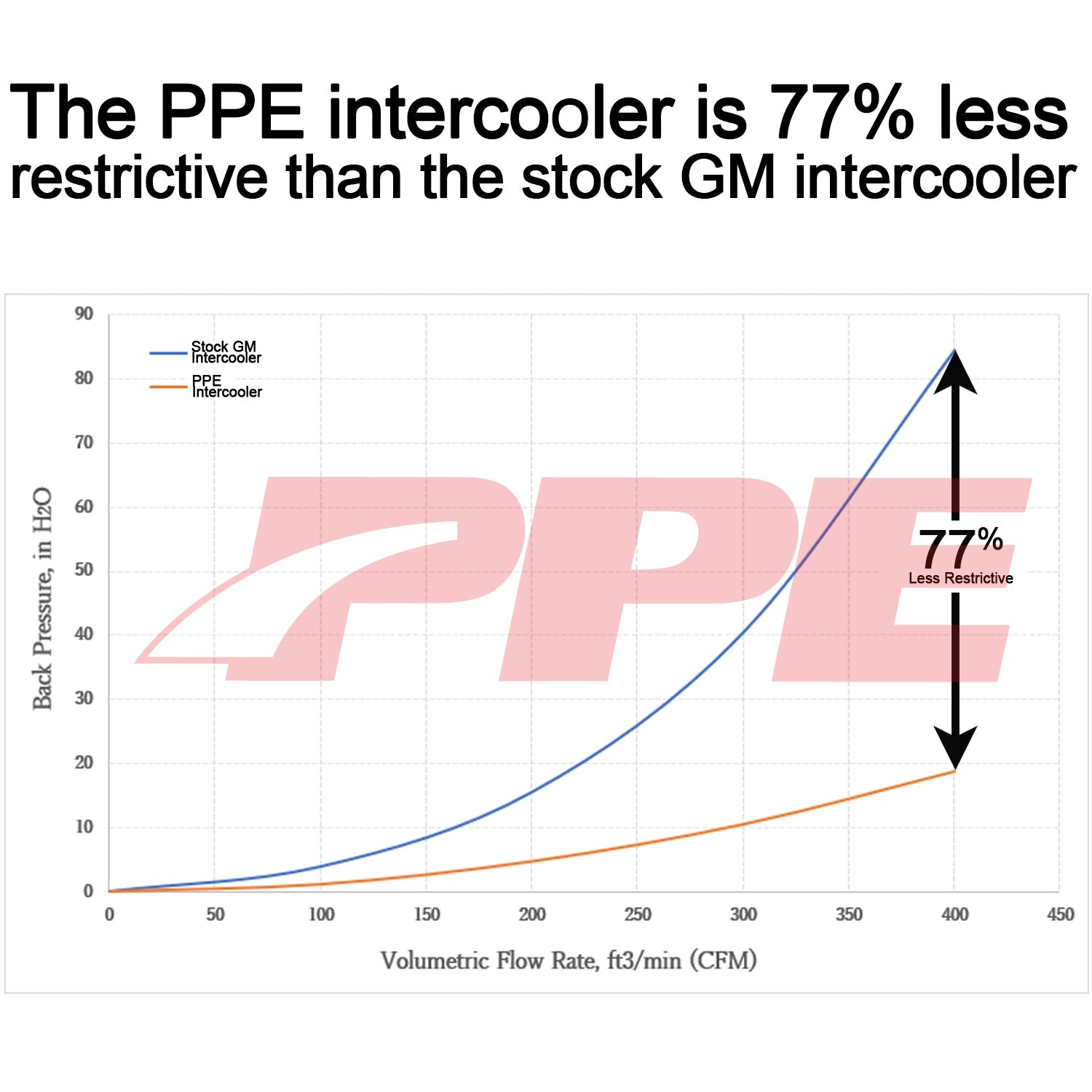 Cooler and denser charge air can also help reduce exhaust gas temperature (EGTs) and increase fuel efficiency. It also significantly improves the airflow and lowers the pressure drop which results from the flow-optimized, cast aluminum end tanks and a larger less restrictive core structure. The PPE intercooler is 77 percent less restrictive than the stock GM intercooler.