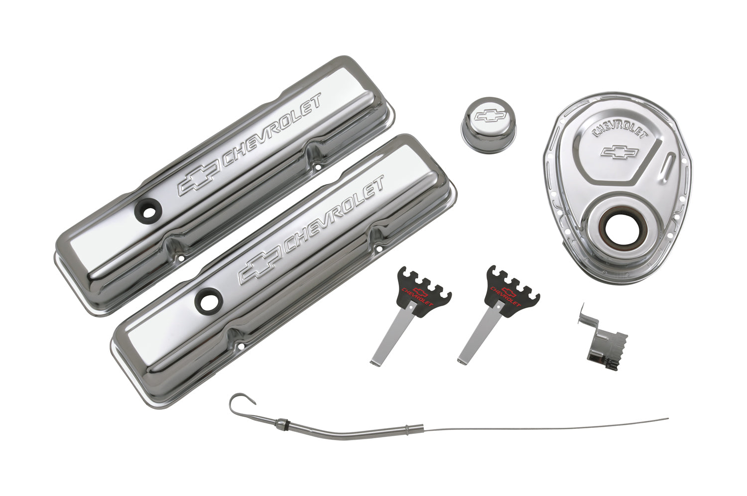 Chrome Dress-up Kit for 1958-1986 Chevrolet Small-Block V8. Includes two short baffled Bowtie valve covers (141-102), plus Bowtie timing chain cover with GM production oil seal installed (141-215), two black/red Bowtie 4-wire looms (141-636), one Bowtie push-in air breather (141-616), oil dipstick (141-550), timing tab for 8 Inch Balancer (141-202), and two grommets (air breather cap and PCV) (141-615). This is Officially Licensed Chevrolet Performance Parts Product. Sold as one kit.