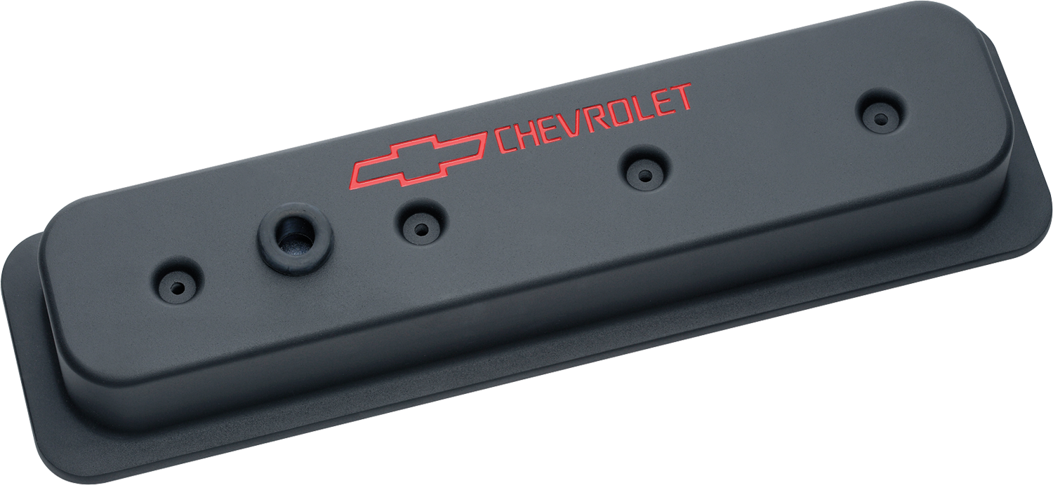 Proform 141-131 - Engine Valve Covers Center Bolt Style Die Cast Black w/ Bowtie Logo SB Chevy Recessed Red Chevrolet & Bowtie Logos Chevrolet Performance Parts