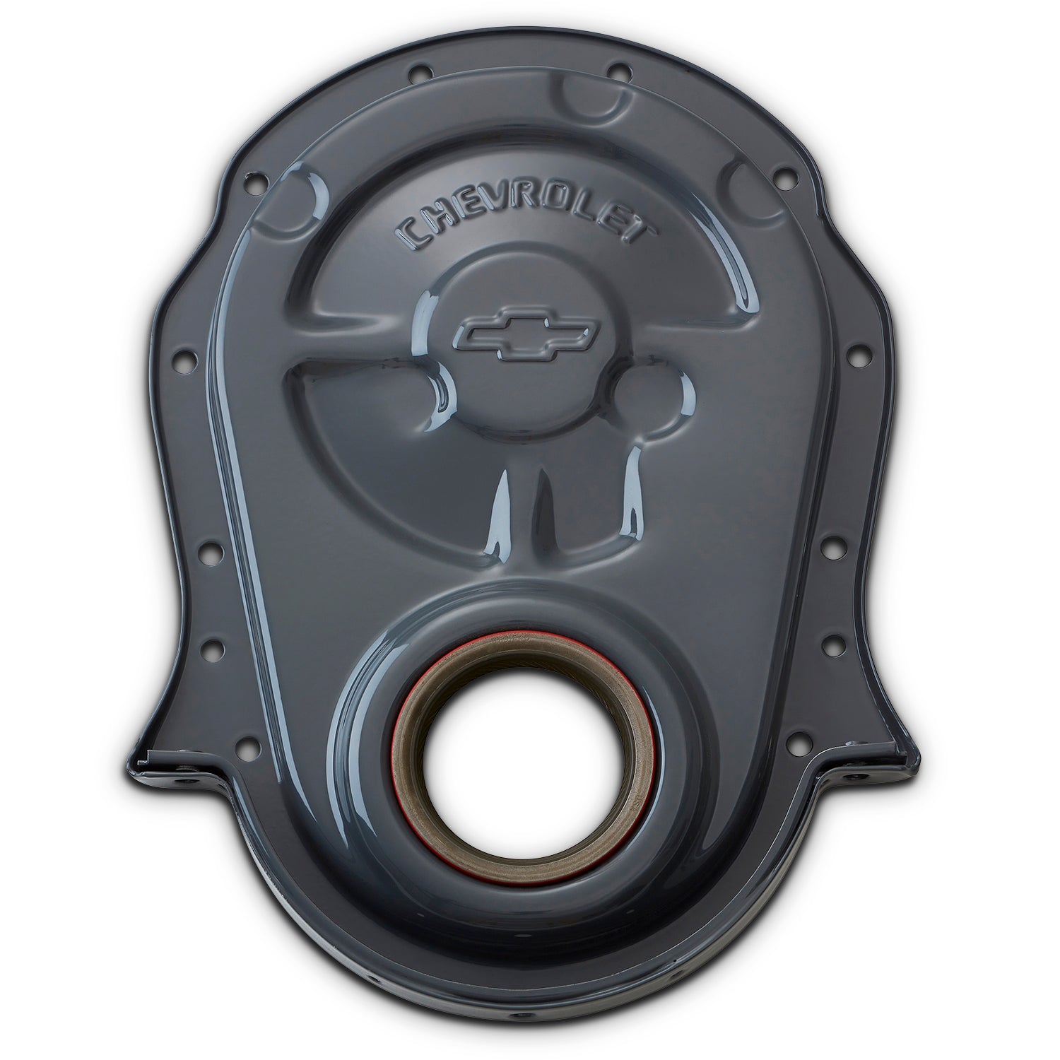 This Shark Gray timing chain cover has distinctive recessed Bowtie and CHEVROLET Emblems with inlaid red paint. For long-term corrosion resistance the cover is electrostatically painted and baked with a durable gray epoxy.