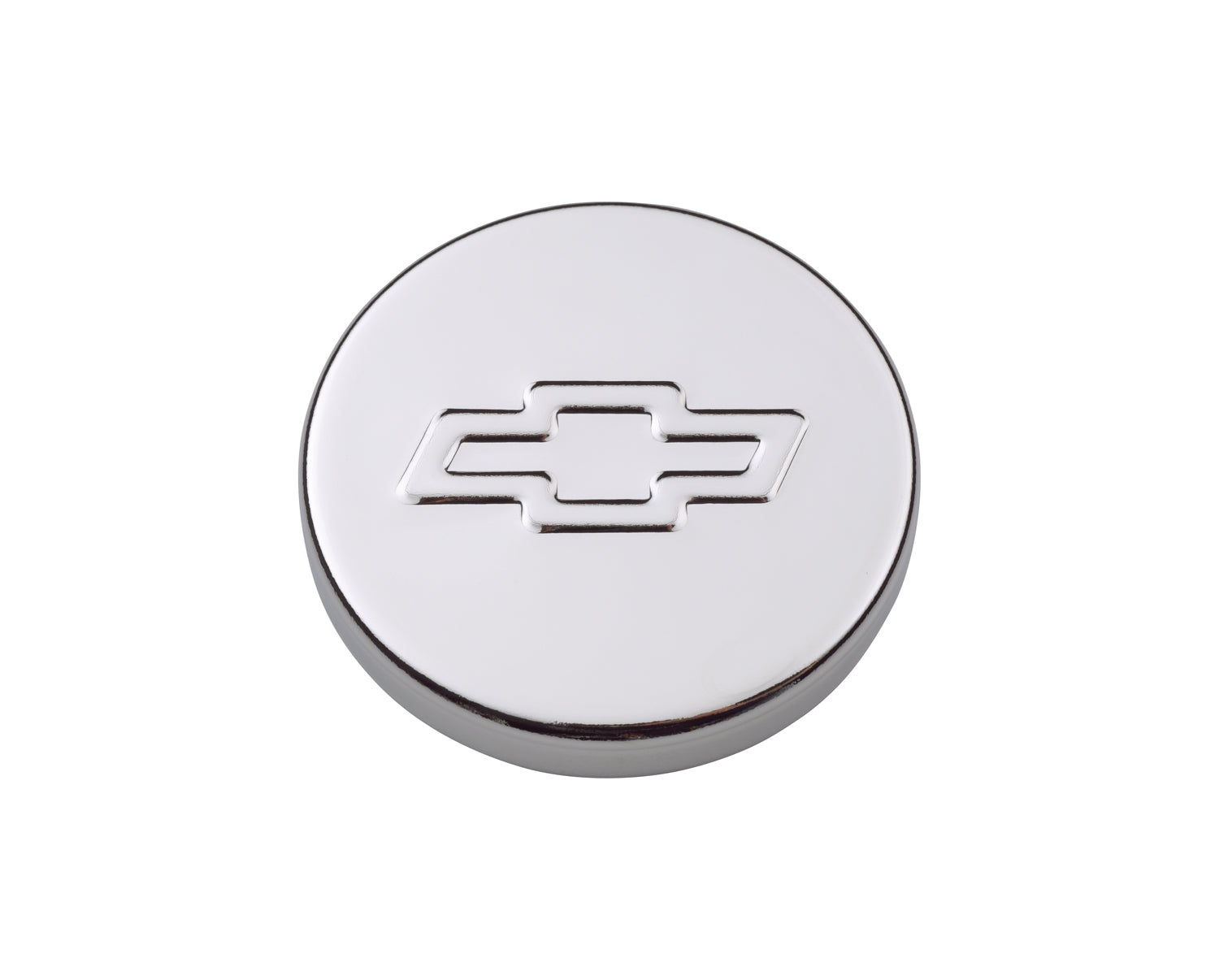 Engine Oil Filler Cap. Made from high-quality steel with Chevy Bowtie Logo embossed into the top. Universal Fitment for 1.22 Inch Diameter Valve Cover Holes. Push-In Style. Sold Individually.