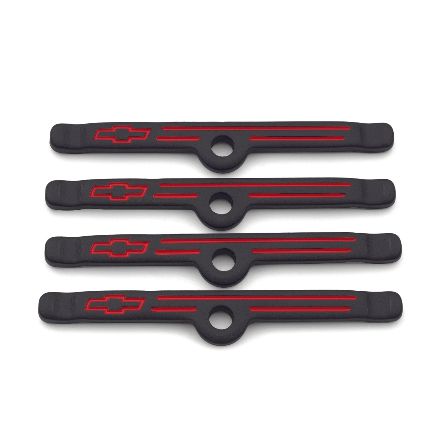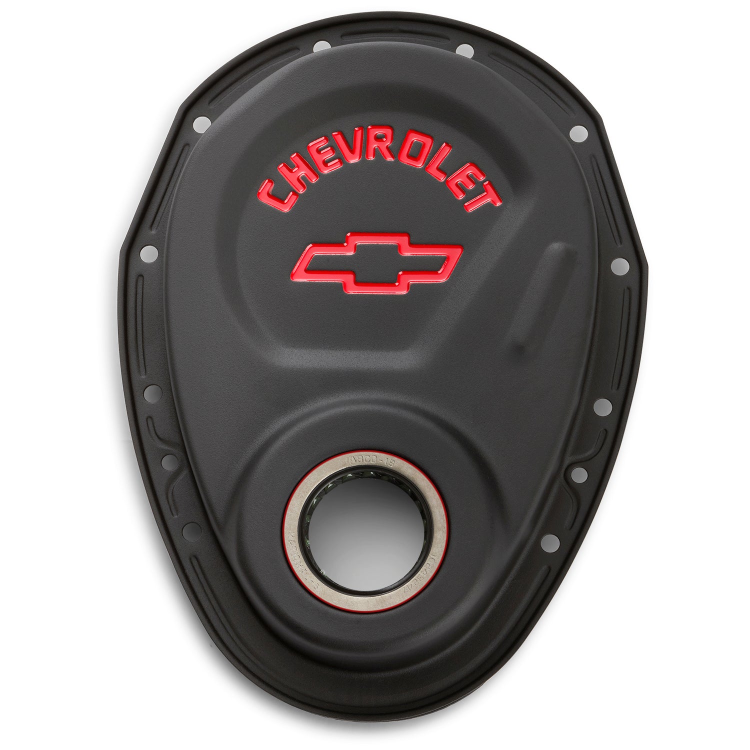 High-Tech Series Dress-Up Kit for Chevrolet Small-Block V8, 1958-1986. Includes tall baffled Bowtie valve covers, Chevrolet 14 Inch Classic Air Cleaner with element and Bowtie center nut, plus Bowtie timing chain cover with GM production oil seal installed, Bowtie push-in air breather, Bowtie Valve Cover Wing Nuts, Bowtie Valve Cover Hold Down Clamps, and grommets (air breather cap and PCV). All of these items in Black Crinkle Finish With Red Chevrolet and Bowtie Logos. This is Officially Licensed Chevrolet Performance Parts Product. Sold as one kit.