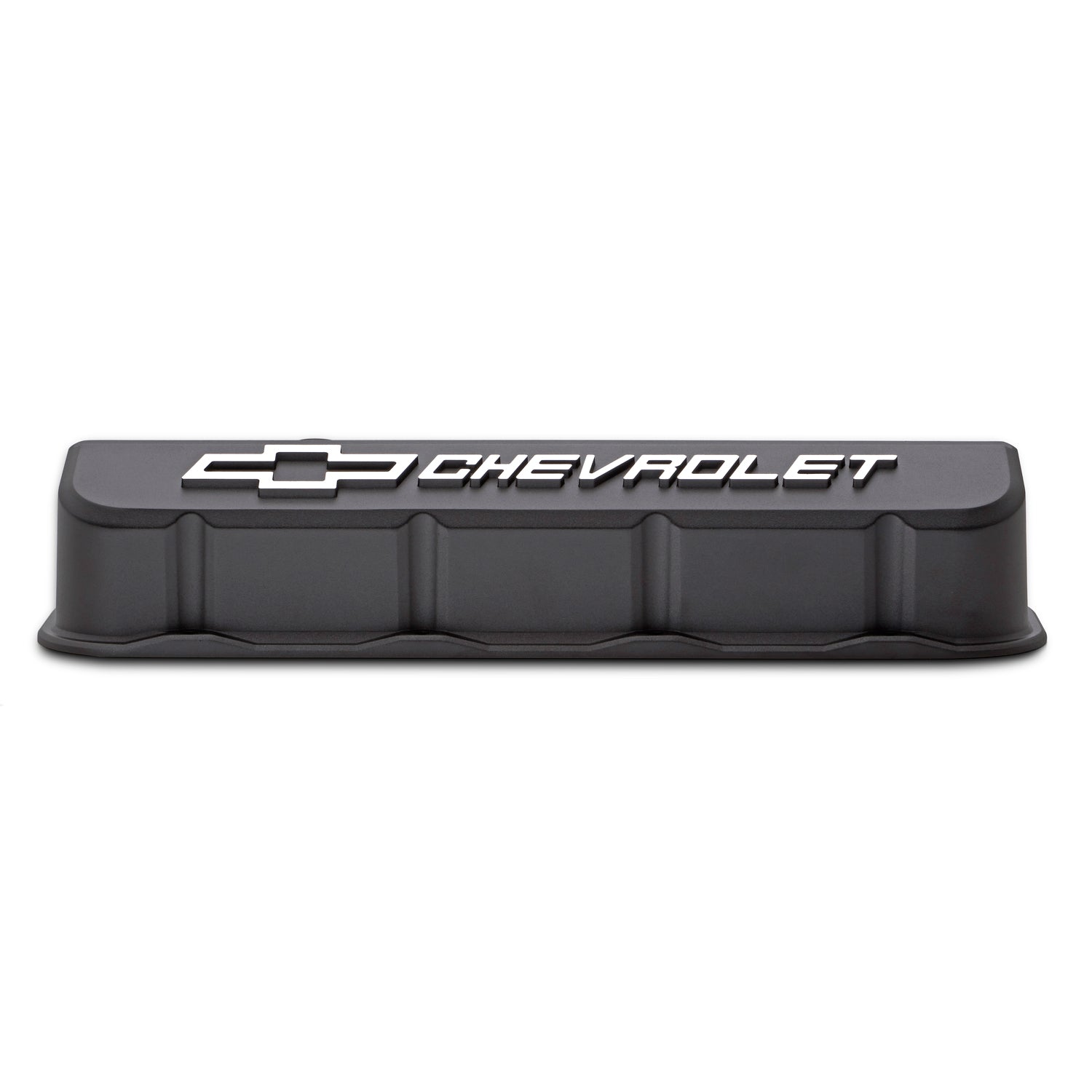 Valve Cover - Slant-Edge - Tall - Baffled - Breather Hole - Raised Chevrolet Logo - Aluminum - Black Crinkle Powder Coat - Big Block Chevy - Pair
