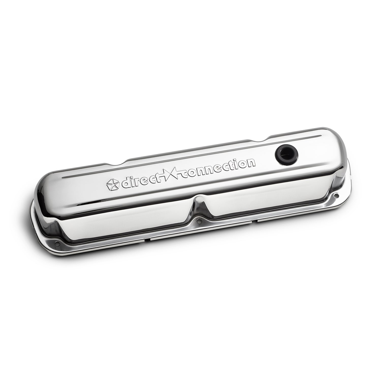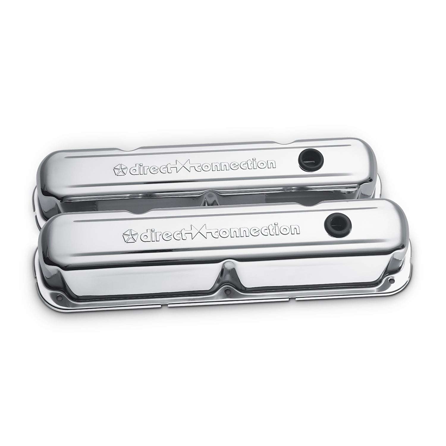 The vintage Direct Connection emblem has been stamped into these valve covers for a nice raised 3D look. Beautiful chrome finish that coordinates nicely with other chrome engine dress-up parts. Oil restricting baffles are pre-installed. All valve covers are sold in pairs, and come equipped with air breather and PCV grommets, unless specified otherwise.