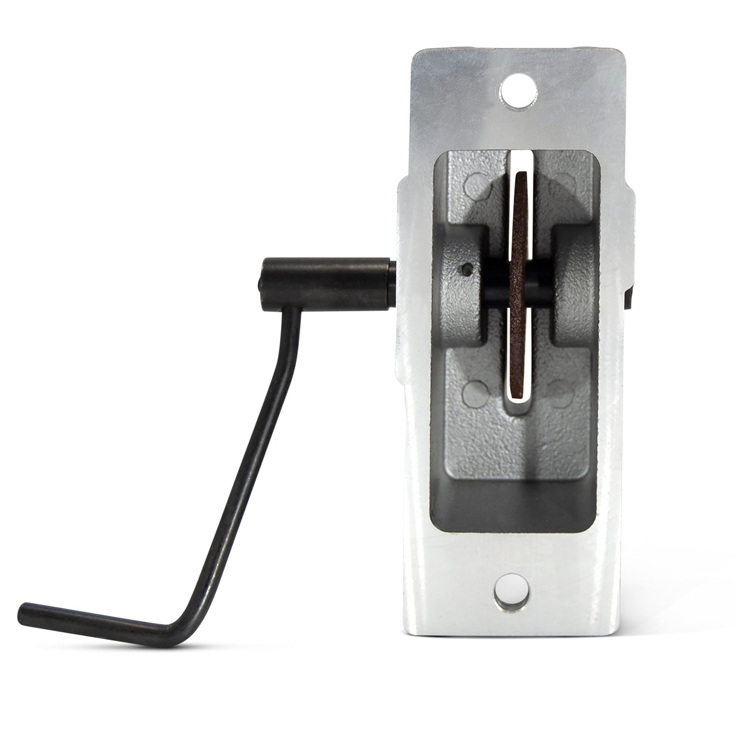 To assure proper piston ring end-gap, the piston ring filer enables the user to file piston rings quickly and accurately. Position the piston ring firmly against the dowel pins, crank the handle to turn the abrasive wheel. Using a feeler gauge, file the piston ring to meet the manufacturer specifications. Sold individually.