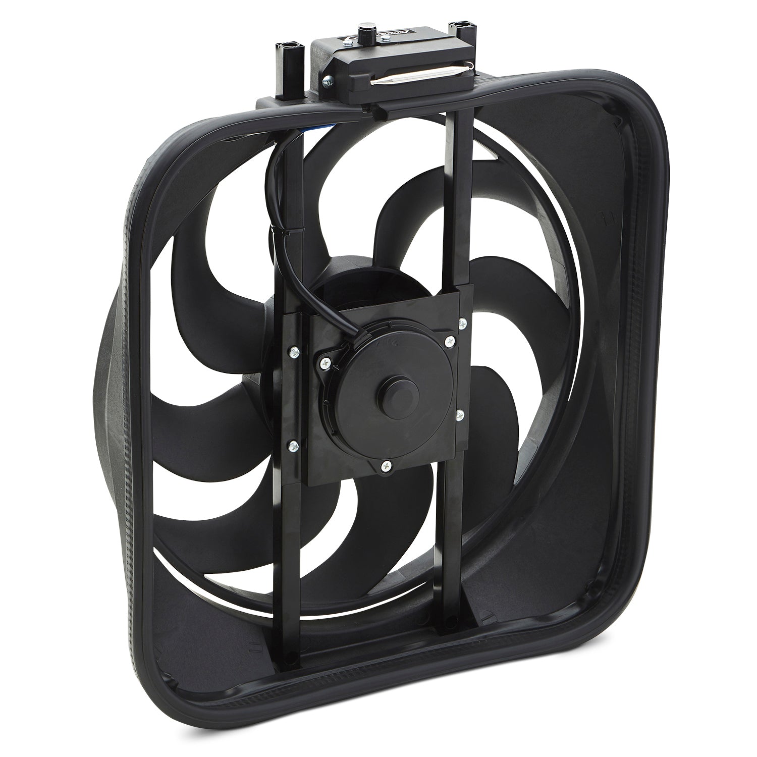 Your stock fan robs your ponys engine of up to 15 or more horsepower! Replace it with a rugged, quieter, fan equipped with an adjustable 180-240F. thermostat. Bolts to your radiator supports using sturdy brackets. With a heavy-duty motor, and 15in diameter, this unit pulls up to 2,800 cfm of air, cooling vehicles with up to 250+ HP without air and 220+ HP with air. Ultra-thin design to fit cramped locations. Reinforced glass filled polypropylene blade and plastic housing for minimized weight. Sold as a kit.