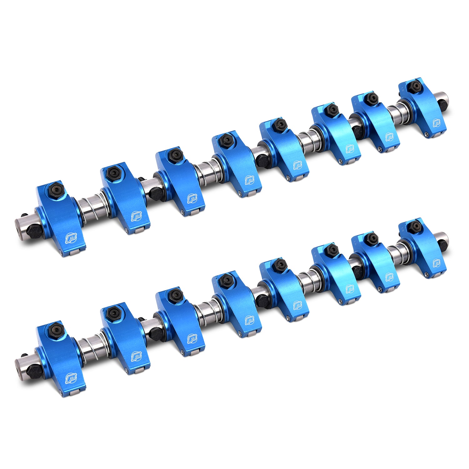 Rid your engine of internal friction with roller-tipped rocker arms. The race-proven roller tip not only unleashes horsepower, it also lengthens valve train component life and reduces wear and tear on valve stem tips. Precision machined to insure consistency and ratio accuracy. Each rocker includes a bronze bushing, and a newly designed shaft-to-rocker self oiling system. 16 blue anodized aluminum roller rockers with laser-etching, hardened shaft, and hardware included. Stock mounting bolts are not included and should be re-used.