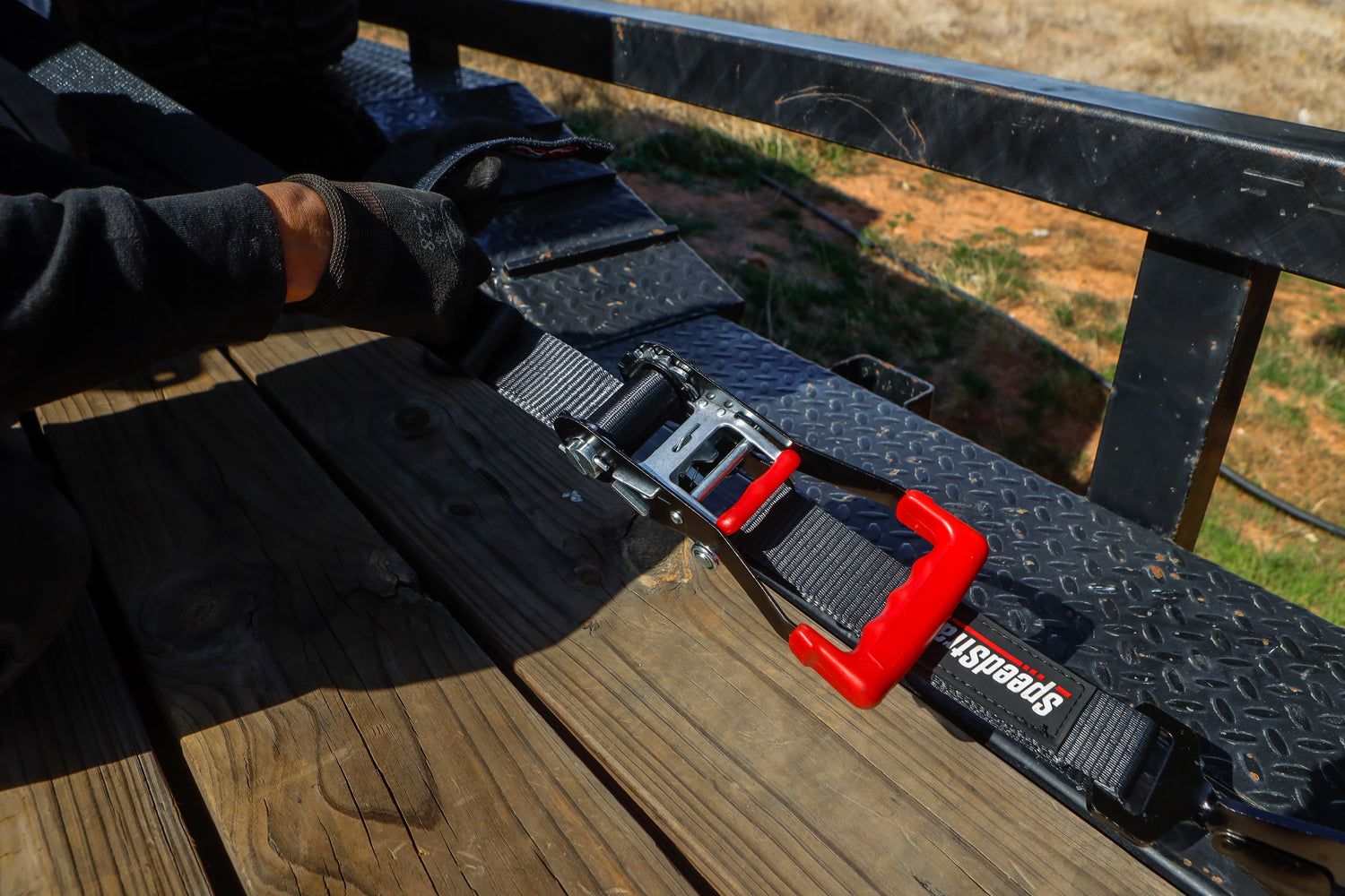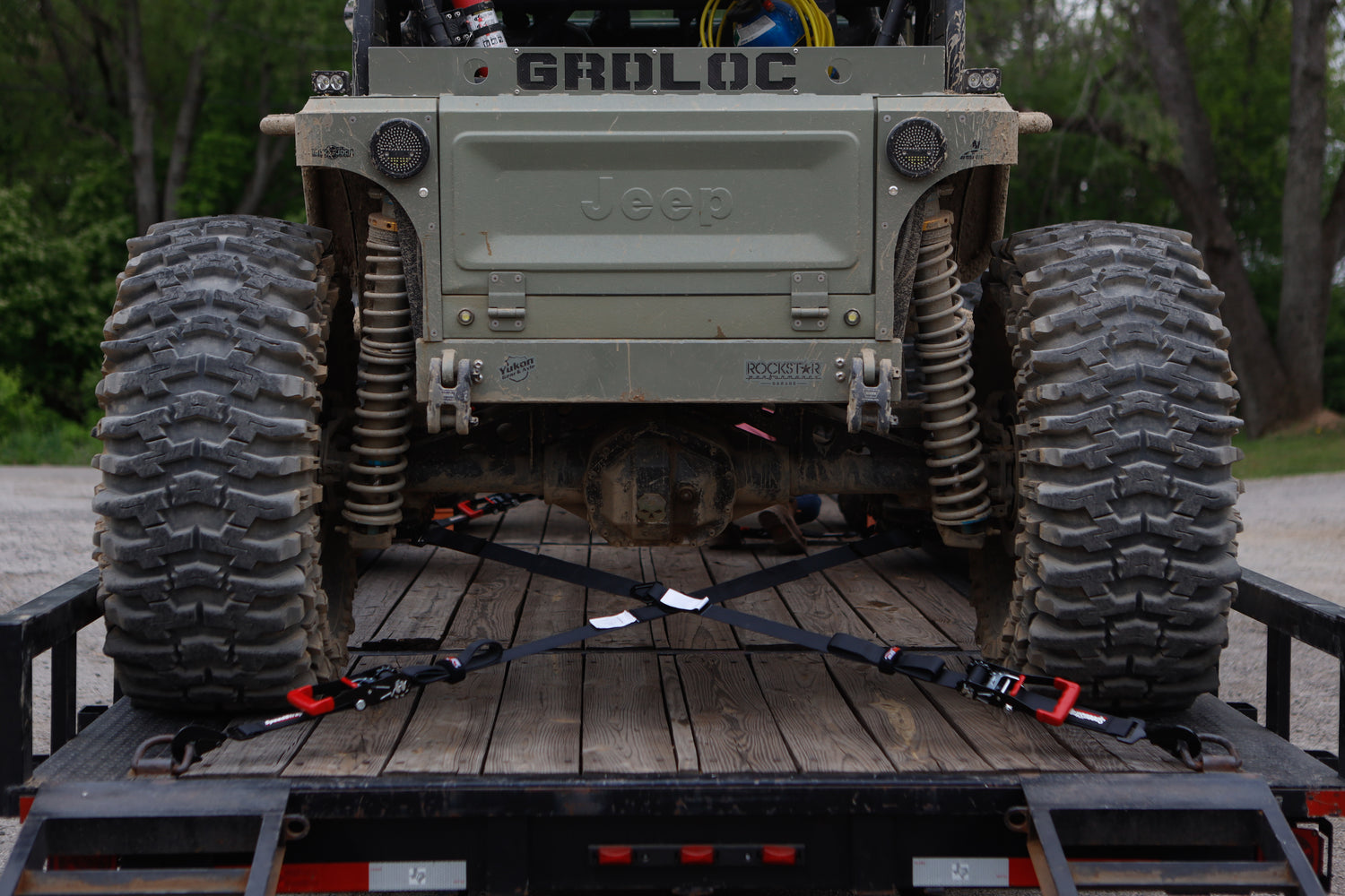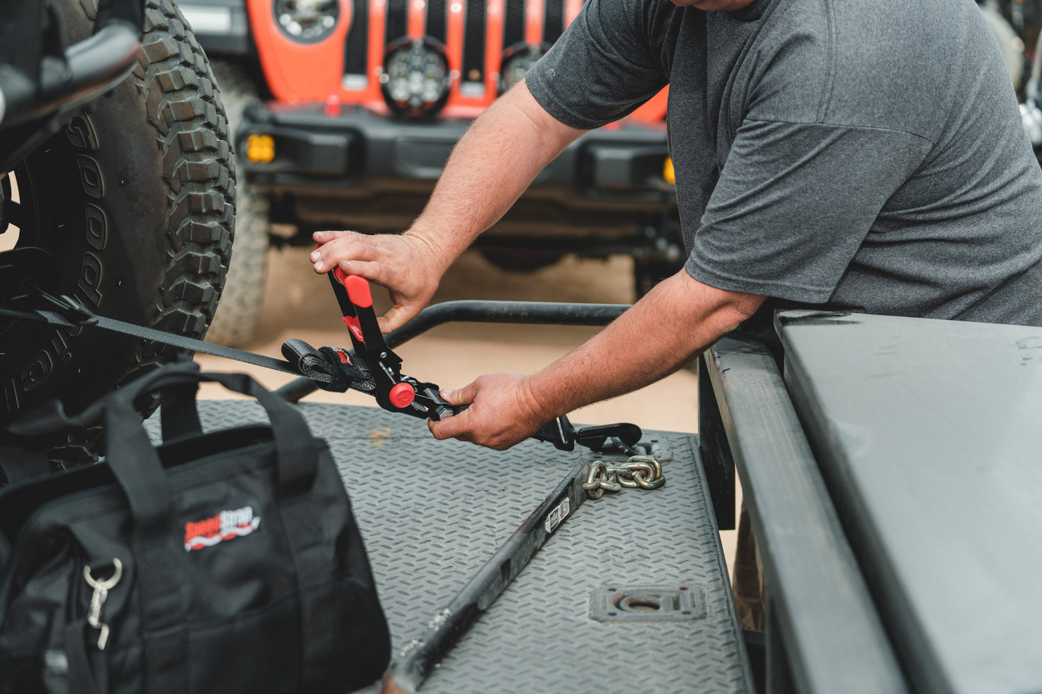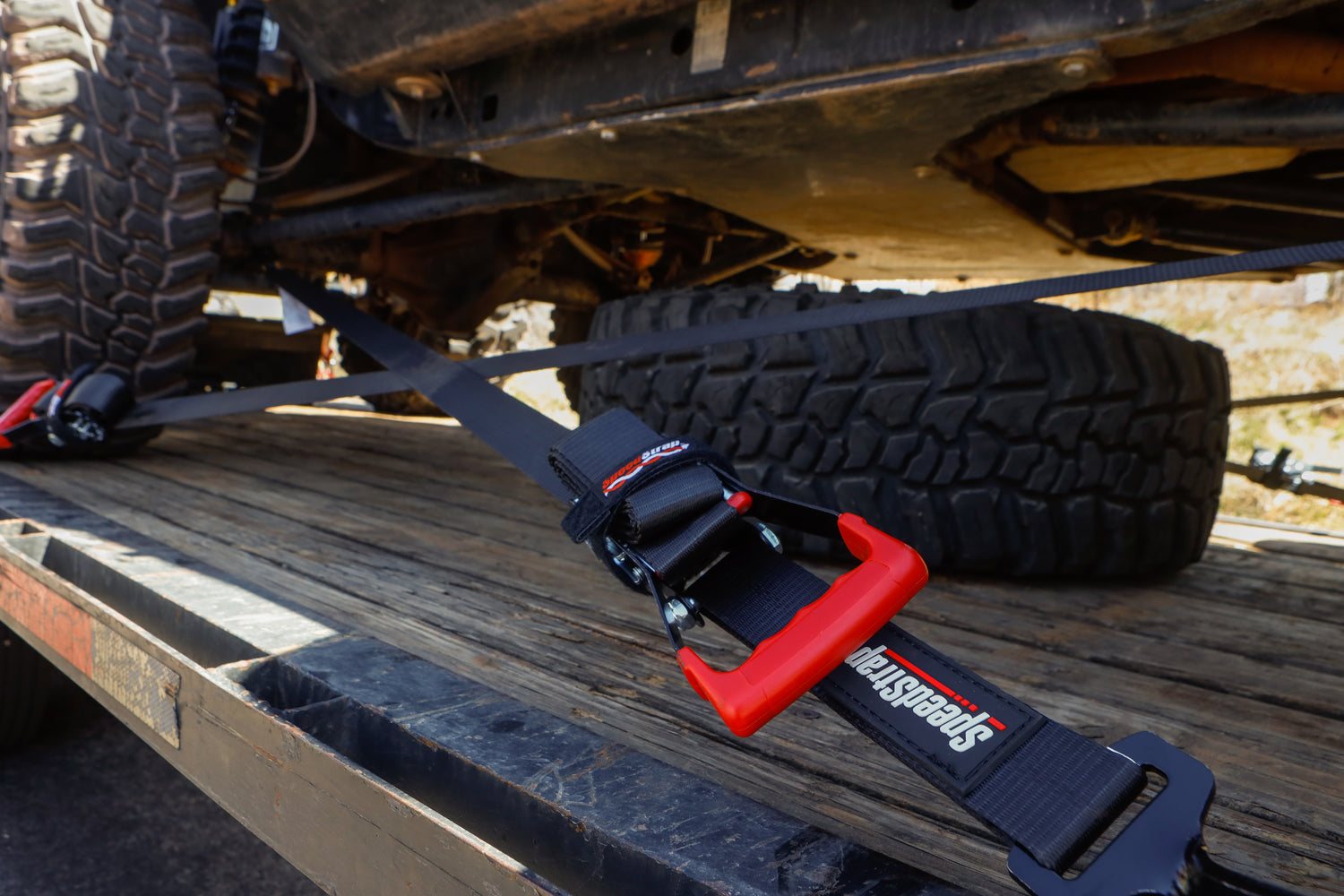 This heavy duty tie-down is great for securing Trucks, Jeeps, and Buggies. The high quality ratchet mechanism features a wide handle molded grip and cushioned release handle. Large twisted snap hooks on either end keep the strap secure, and wont come undone. The tie-down features a built in Axle-Wrap towith protective sleeve prevent damage to your vehicle. 10,000 lb maximum rated capacity and a 3,333 lb safe working load.