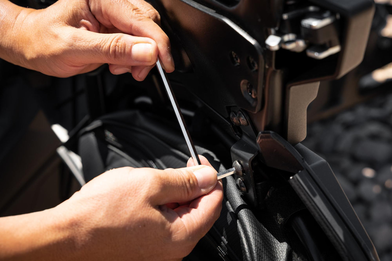 So we created these knee pads to still give you the comfort that you need on long rides. The pads are just thick enough to stop your knees from hitting the doors. Both attach securely to the door by using J-clips, and a hook and loop strip.