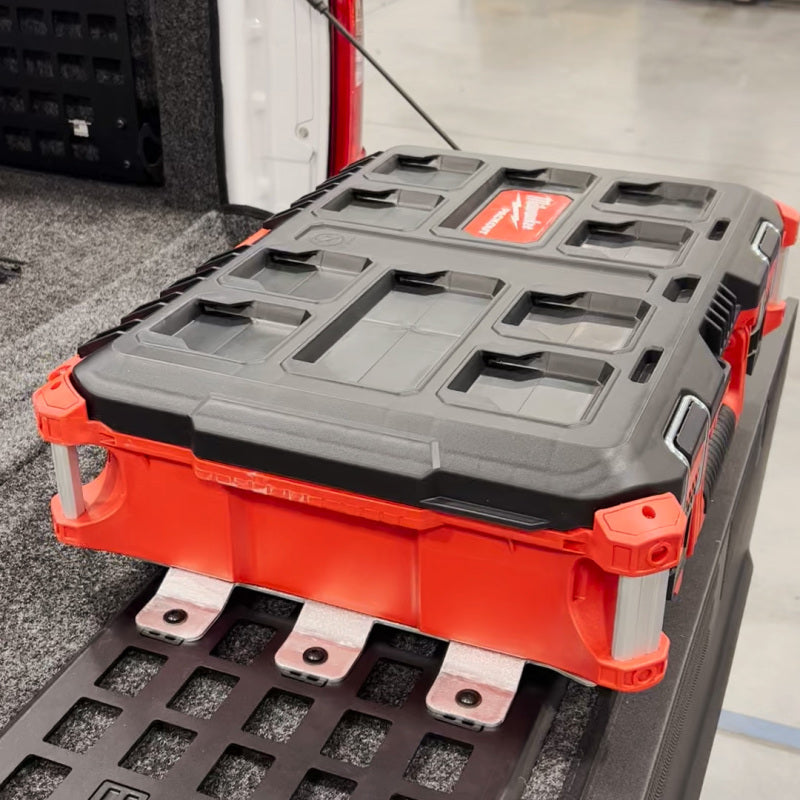 Your MOLLE system just got the upgrade you were waiting for, as it is now 100% compatible with the Milwaukee PACKOUT Systems! This new, versatile, and heavy-duty bracket allows you to mount any PACKOUT Storage System directly to your expensive truck without having to drill or modify anything in any way. This bracket is constructed out of 1/8-inch aluminum, guaranteeing you the best weight capacity and durability compared to other brands. Each Putco MOLLE mount bracket for the Packout can handle up to 250lbs flat or 200lbs on an upright position. Giving you the best peace of mind when trying to keep your valuable tools safe and secure while traveling across tough terrain. Your heavy-duty tools can very quickly exceed the weight capacity of the brittle plastic or steel brackets that they are attached to, make your first choice the best choice with the Putco MOLLE PACKOUT bracket system. Each Kit includes a MOLLE PACKOUT Bracket and the MOLLE Mounts plates for a very fast and modular installation. Designed and Manufactured in the USA by Putco Inc and backed by Putco’s NeveRust™ Limited Lifetime Warranty.