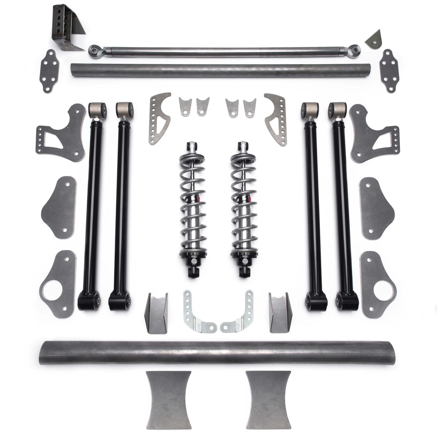 PRODUCT OVERVIEW: QA1's Pro Rear Parallel 4-Link system with Panhard Bar Kit simplifies the fabrication process for vehicles that lack aftermarket support and offers an easy solution that provides ride height adjustability, packages easily, and offers a simple install process. These DIY kits produce professional-quality results and great looks in a convenient, easy-to-order package. Designed for the DIY enthusiast, the kit contains high-quality, MIG-weldable components that ensure a safe and well-engineered design that’ll get your favorite Truck or Hot Rod the stance and ride quality it deserves. ADAPTABILITY This kit includes all components and hardware for assembling and mounting the trailing arms, shocks, and springs. The raw components can be cut to length and welded as needed, allowing for adaptation to a range of applications. Refer to the provided dimensional diagrams and renderings for assistance with your custom install. PACKAGING & SIMPLICITY The parallel four-link system, by design, packages easily into many applications, making it ideal where space is limited. The parallel four-link system is easy to tune, making it great for DIY mechanics while still meeting demands of high-end builds. Powder coated trailing arms with forged bushings offer great looks, durability, and a smooth ride. TUNABILITY & RIDE HEIGHT ADJUSTMENT Adjustable coilovers provide dampening tunability and ride height adjustability, ensuring you achieve your desired stance and ride quality. The unique valving of the Ultra Ride QA1 coilovers provide a comfortable, tunable ride quality that enhances handling without sacrificing ride quality. KIT CONTENTS: Powder coated trailing arms and forged bushings adjust from 24-5/8" to 25-½" Trailing arm brackets for 3" axle Panhard bar max length 37" 40" trailing arm crossmember 40" shock crossmember and mount tabs All hardwareQA1 Ultra Ride Coilovers and Springs MADE IN THE USA FITMENT NOTES Welding required Works with 3 in. axle tubes