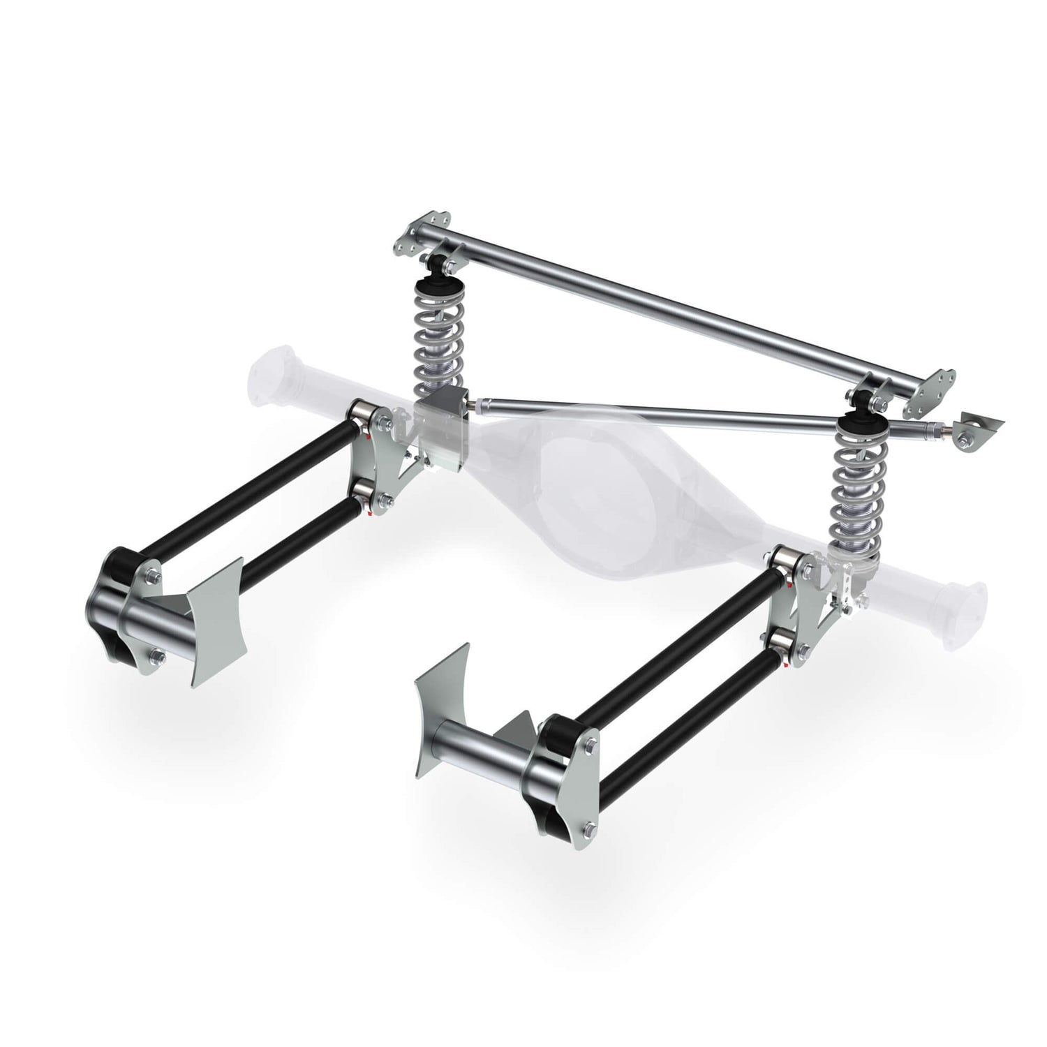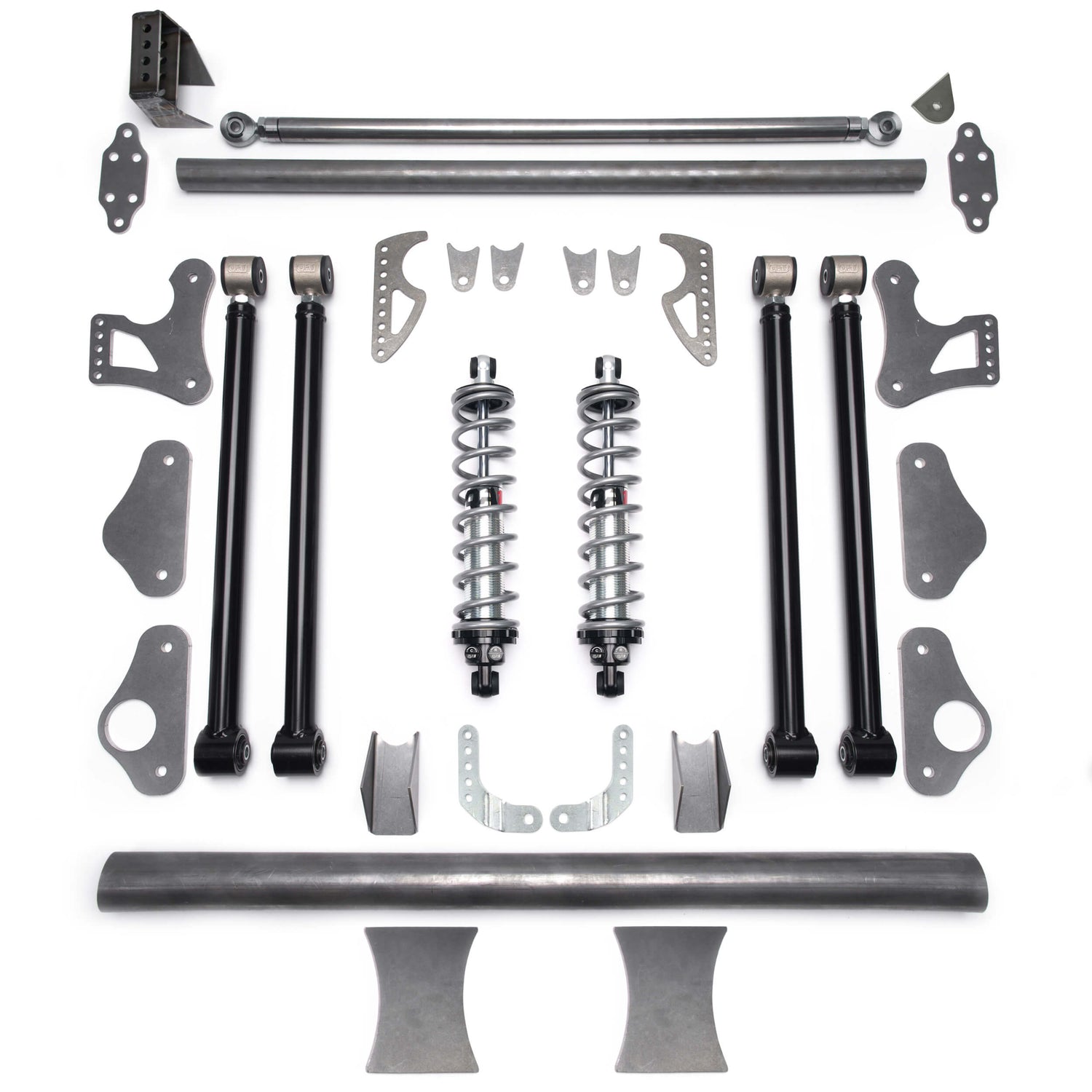 PRODUCT OVERVIEW: QA1's Pro Rear Parallel 4-Link system with Panhard Bar Kit simplifies the fabrication process for vehicles that lack aftermarket support and offers an easy solution that provides ride height adjustability, packages easily, and offers a simple install process. These DIY kits produce professional-quality results and great looks in a convenient, easy-to-order package. Designed for the DIY enthusiast, the kit contains high-quality, MIG-weldable components that ensure a safe and well-engineered design that’ll get your favorite Truck or Hot Rod the stance and ride quality it deserves. ADAPTABILITY This kit includes all components and hardware for assembling and mounting the trailing arms, shocks, and springs. The raw components can be cut to length and welded as needed, allowing for adaptation to a range of applications. Refer to the provided dimensional diagrams and renderings for assistance with your custom install. PACKAGING & SIMPLICITY The parallel four-link system, by design, packages easily into many applications, making it ideal where space is limited. The parallel four-link system is easy to tune, making it great for DIY mechanics while still meeting demands of high-end builds. Powder coated trailing arms with forged bushing ends offer great looks, durability, and a smooth ride. TUNABILITY & RIDE HEIGHT ADJUSTMENT Adjustable coilovers provide dampening tunability and ride height adjustability, ensuring you achieve your desired stance and ride quality. Double adjust QA1 coilovers provide a tunability that provides the desired ride quality, handling, and performance for any application. KIT CONTENTS: Powder coated trailing arms and forged bushings adjust from 24-5/8" to 25-½" Trailing arm brackets for 3" axle Panhard bar max length 37" 40" trailing arm crossmember 40" shock crossmember and mount tabs All hardware QA1 Double Adjust Coilovers and Springs MADE IN THE USA FITMENT NOTES Welding required Works with 3 in. axle tubes