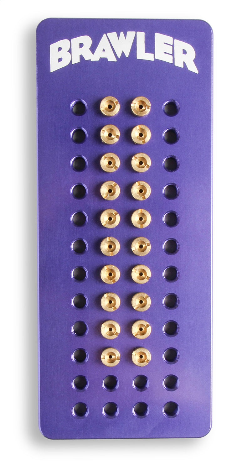 Brawler Jet assortments will help you tune your carburetor at home or the track. Each assortment comes with ten pairs of jets in size ranges of; 60-69, 70-79, 80-89, or 90-99. The billet plate that is included has enough room to hold 48 jets and comes in a purple anodized finish.