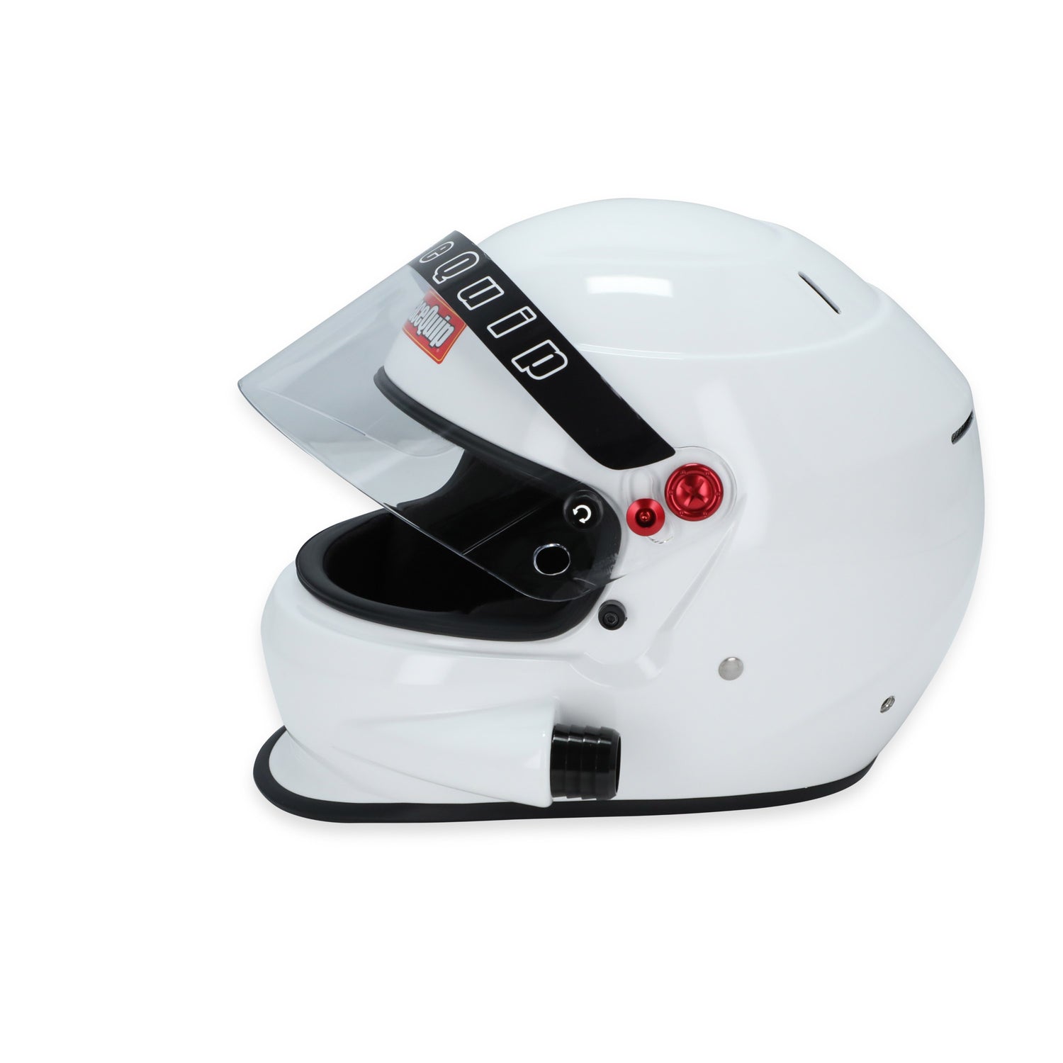 The RaceQuip PRO20 Side Air is a Snell SA2020 rated full face auto racing helmet that incorporates contemporary styling with modern production techniques. These helmets are also sometimes called forced air, blower, or pumper helmets because they have a provision on the helmet to attach a fresh air hose. The shell is built using composite materials placed into pressurized steel molds to achieve the best combination of light weight and strength. Reinforced M6 threaded HANS/HNR inserts are mated to the shell along with an expanded polystyrene (EPS) liner. HANS or other Head and Neck Restraint device anchor posts (not included) can be easily attached to the outside of the helmet using the installed M6 threaded inserts. Forced air is plumbed into the left side of the helmet through a standard 1.250" barbed fitting so air flows across the face shield from left to right for cooling and anti-fogging. The distortion free 3mm polycarbonate face shield features a red anodized aluminum pivot kit, hand ratcheting Tear Off posts, and a silicone eye port gasket to seal out dust and dirt. A wide eye port provides good peripheral vision and allows the use of personal eyewear. The Snell SA rating means that the Nomex® interior and paint are fire retardant as well as the Kevlar chin strap.
