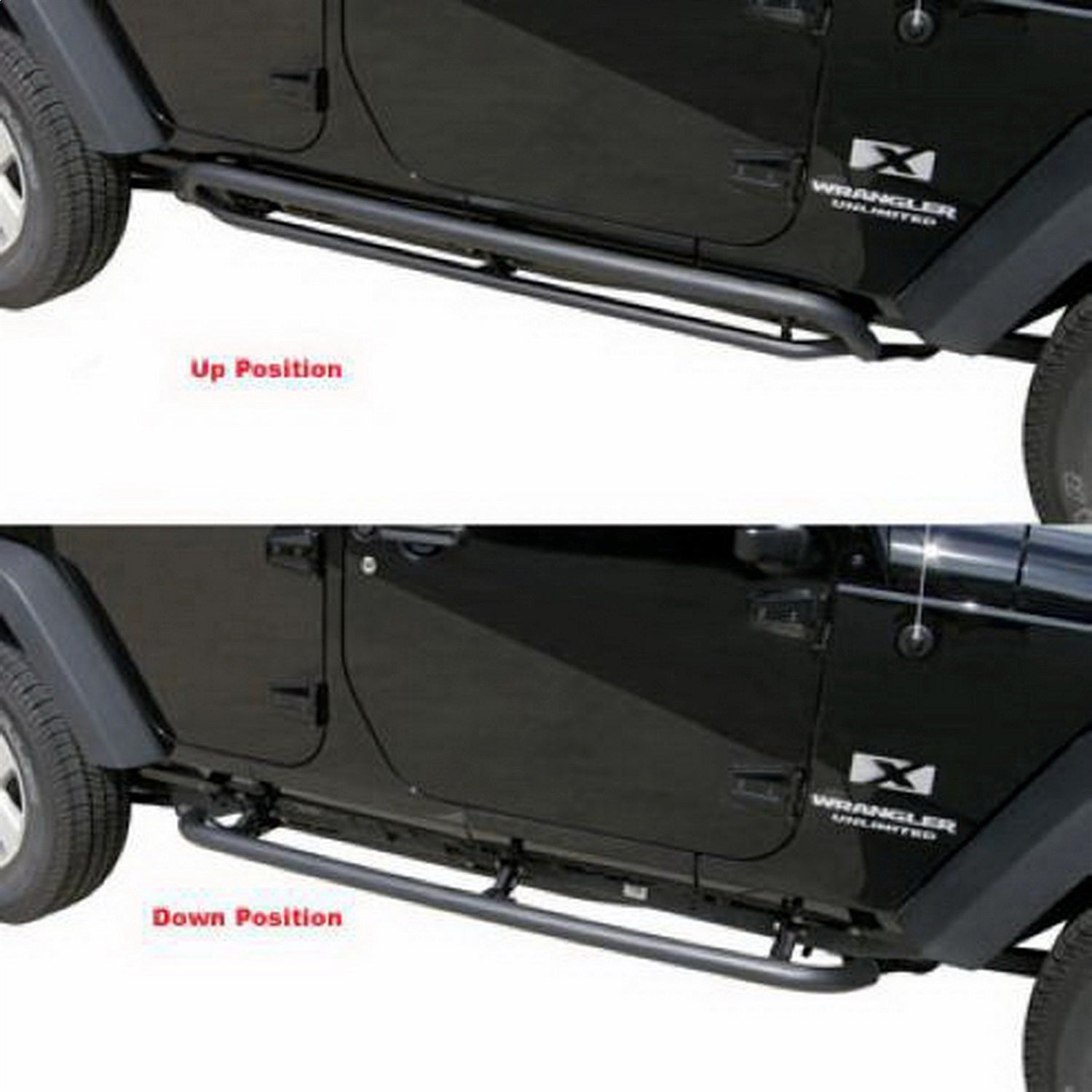 Retractable rockguard step Side Bar application designed for dual use as both an entry step and rocker panel side protection. Use as a side step for street use or release step lock to fold up to the rocker guard position for side protection and added off-road clearance. High pressure gas shocks pull and hold the bar in the upright, rocker guard position. Step pressure on the bar returns and locks the bar into the step bar position. Textured black powder coated finish is durable and compliments factory components. Durable steel construction - 2 in. tube x .120 in. wall.