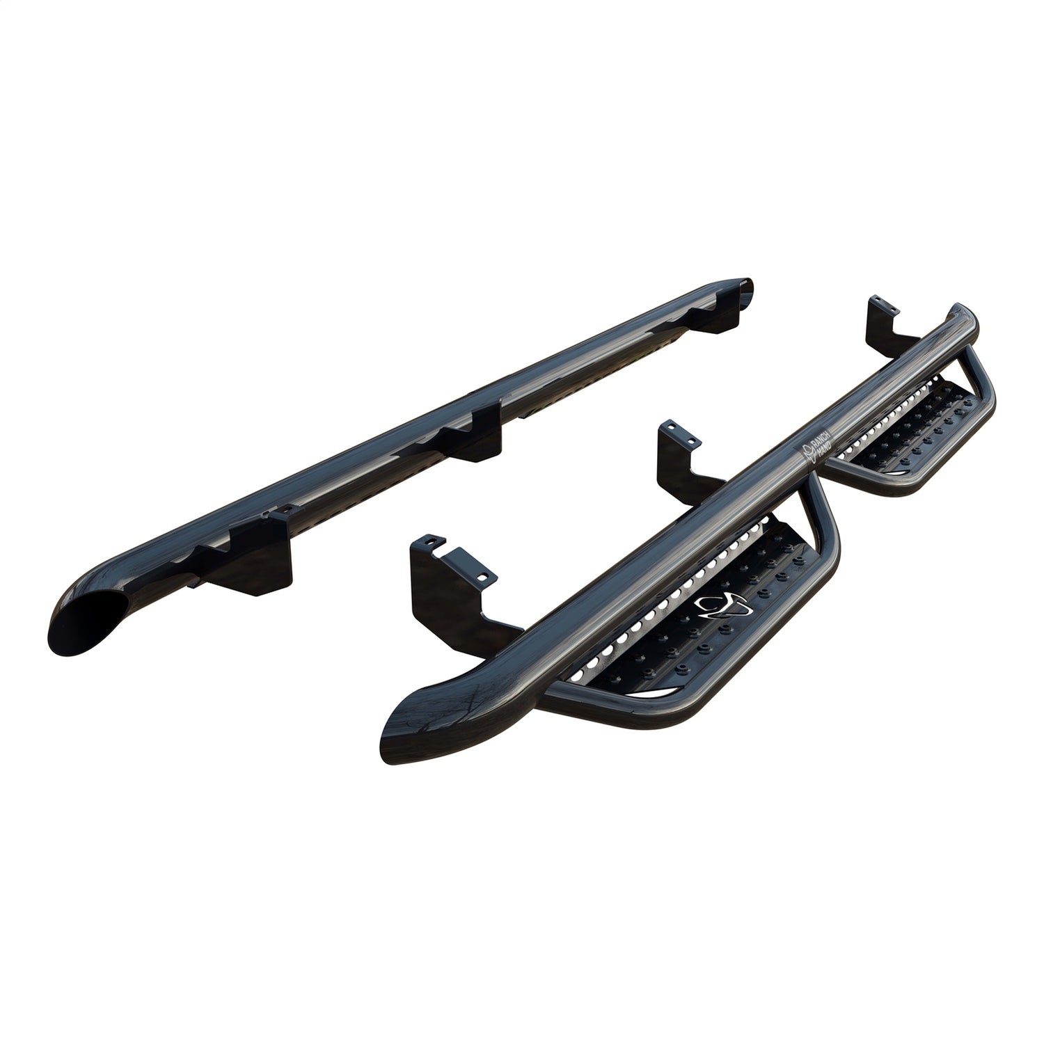 Strong and dependable, Ranch Hand running steps are constructed from 3 in. pipe and 3/16 in. thick brackets for enhanced security to the truck. The steps are frame-mounted in factory locations for easy installation with no drilling required on most models. The front step plates are punched with the official cowboy hat Ranch Hand logo, and all steps have raised steel treads to promote reliable traction when entering or exiting your truck. To maximize safety, Ranch Hand running steps have a vehicle-specific configuration to match the door layout and promote optimal safety and convenience. They feature 1-1/2 in. diameter, drop-down tubes that hold 4 in. wide, 12-gauge punched plates for the perfect platform for stepping into your truck with ease. Each set of steps is finished with a tough, dual-layer A-coat and black powder coating that provides exceptional rust resistance for long-lasting dependability. This particular set of Ranch Hand running steps fits select model years of the Toyota Tundra (see application info to verify fitment).