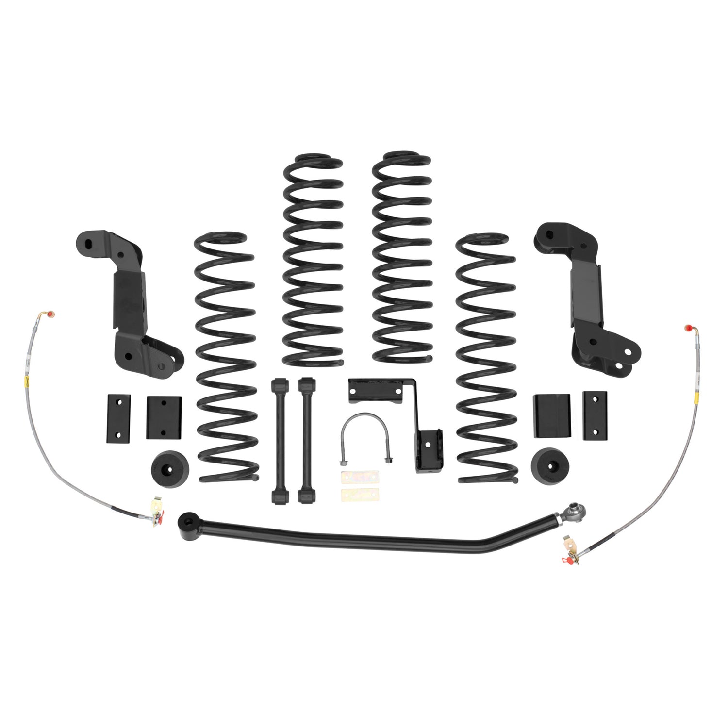 - COMPLETE SOLUTION -- Includes front and rear progressive rate coil springs, adjustable front track bar, front extended sway bar end link, bump stop spacers, front extended length brake lines and mounting hardware