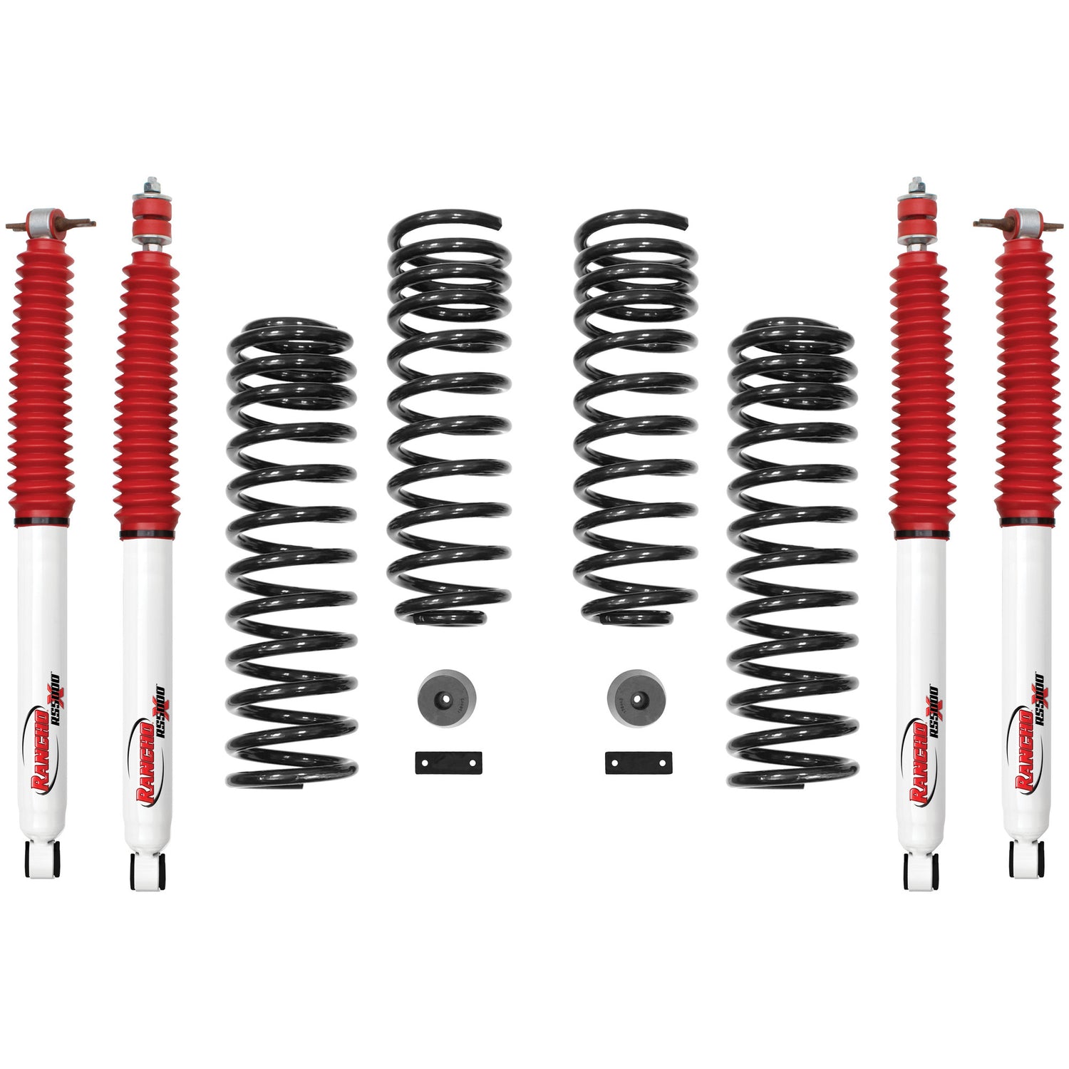 Get your 2-door Jeep® Wrangler JK ready for a day on the trail with the Rancho® 2-in. Progressive Sport suspension system. This premium system features Rancho RS5000®X front and rear shocks that provide additional control and reduce body roll.