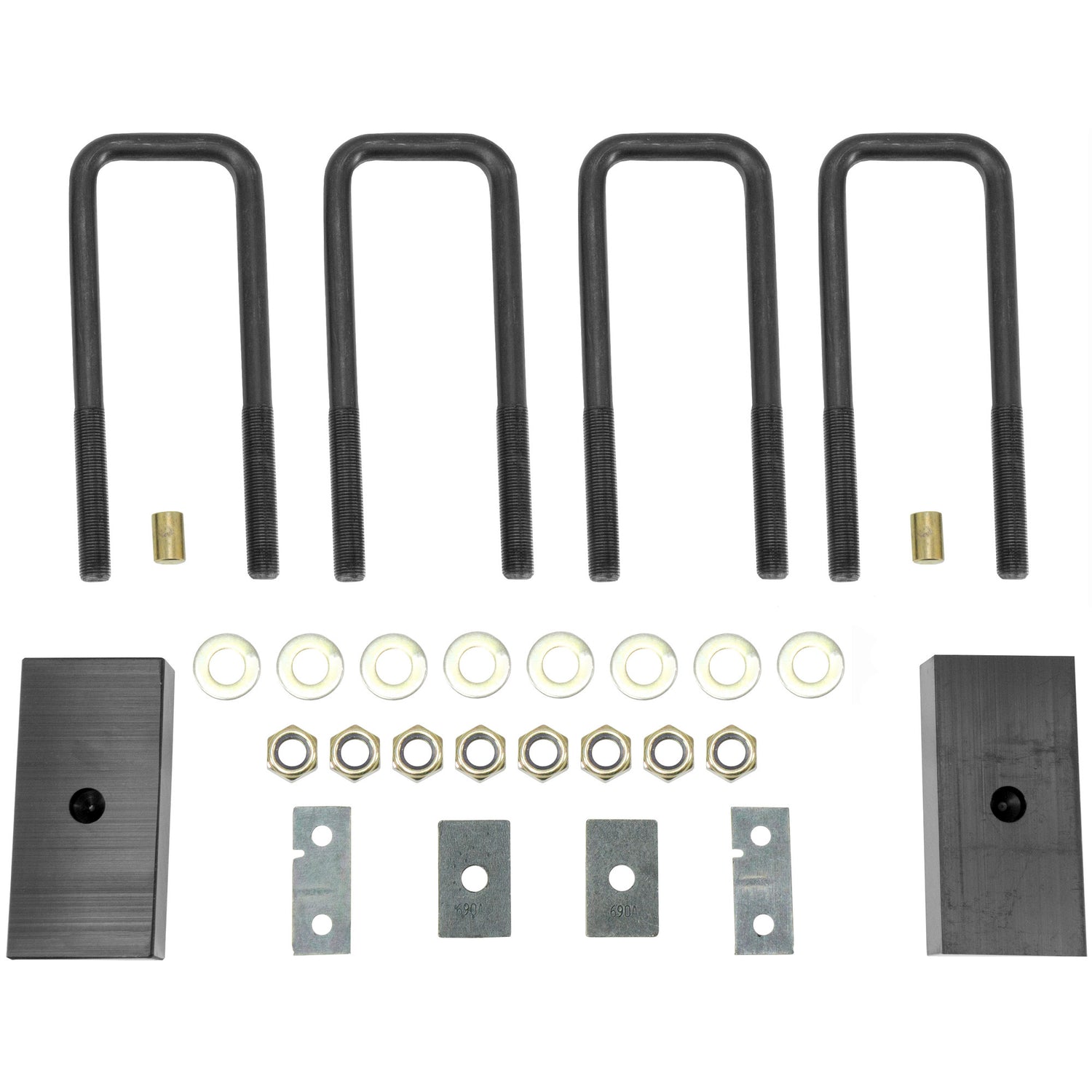 - EASY TO INSTALL -- Kit includes two rear blocks, four coated U-bolts and eight nuts that install easily