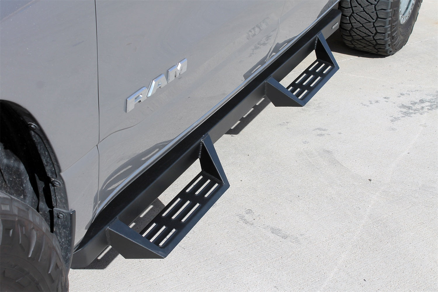 Magnum RT Gen 2 Steps are the 2.0 version of the original RT Step. They are 30% longer and wider with a die stamped slotted step area providing increased traction to securely enter and exit the vehicle in any weather condition. They have a unique modern angled drop step design for easy and comfortable entry into the vehicle. Made from 14 gauge steel and finished with a 3 stage black powder coating system. Quality guaranteed with a limited lifetime manufacturer warranty on the workmanship/structure and a 10 year limited manufacturer warranty on the black powder coated finish.