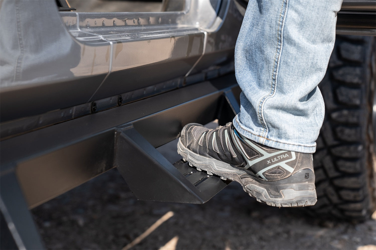Magnum RT Gen 2 Steps are the 2.0 version of the original RT Step. They are 30% longer and wider with a die stamped slotted step area providing increased traction to securely enter and exit the vehicle in any weather condition. They have a unique modern angled drop step design for easy and comfortable entry into the vehicle. Made from 14 gauge steel and finished with a 3 stage black powder coating system. Quality guaranteed with a limited lifetime manufacturer warranty on the workmanship/structure and a 10 year limited manufacturer warranty on the black powder coated finish.