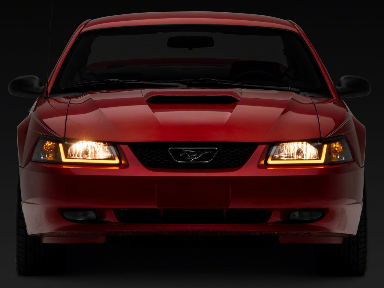Improve the appearance and nighttime driving visibility of your 1999-2004 Ford Mustang just by replacing your old weathered, worn out, and yellowing factory headlights with a brand new pair of Axial Headlights that feature black housings and clear lenses. With an impressive LED Daytime Running Light (DRL) design, that double as sequential turn signals, these Axial Headlights will give your Mustang a whole new look. Manufactured from OEM grade materials, these Headlights are assembled to precise standards for long-lasting quality. These Headlights feature durable, black ABS plastic housings with multi-faceted chromed reflectors, clear polycarbonate lenses, and modern LED lighting. Each housing is weather-sealed to prevent dirt and moisture from harming the state of the art electronics found inside. These Headlights were designed to be a direct plug and play replacement for your vehicle's original factory housings. The DRL light bar portion of the headlight will require splicing into your running lights for operation. Please be sure to have your headlights properly aimed/aligned before driving at night.