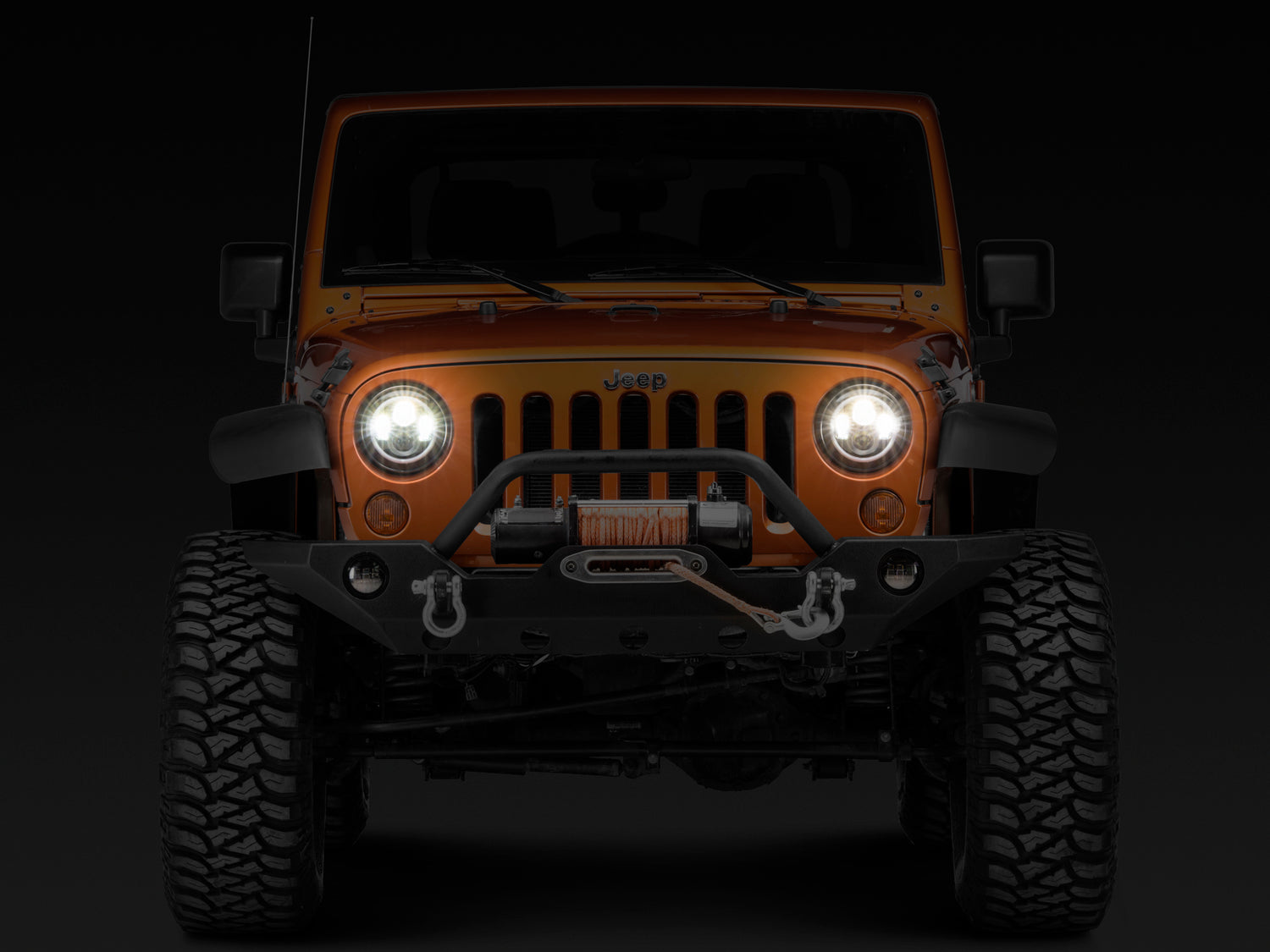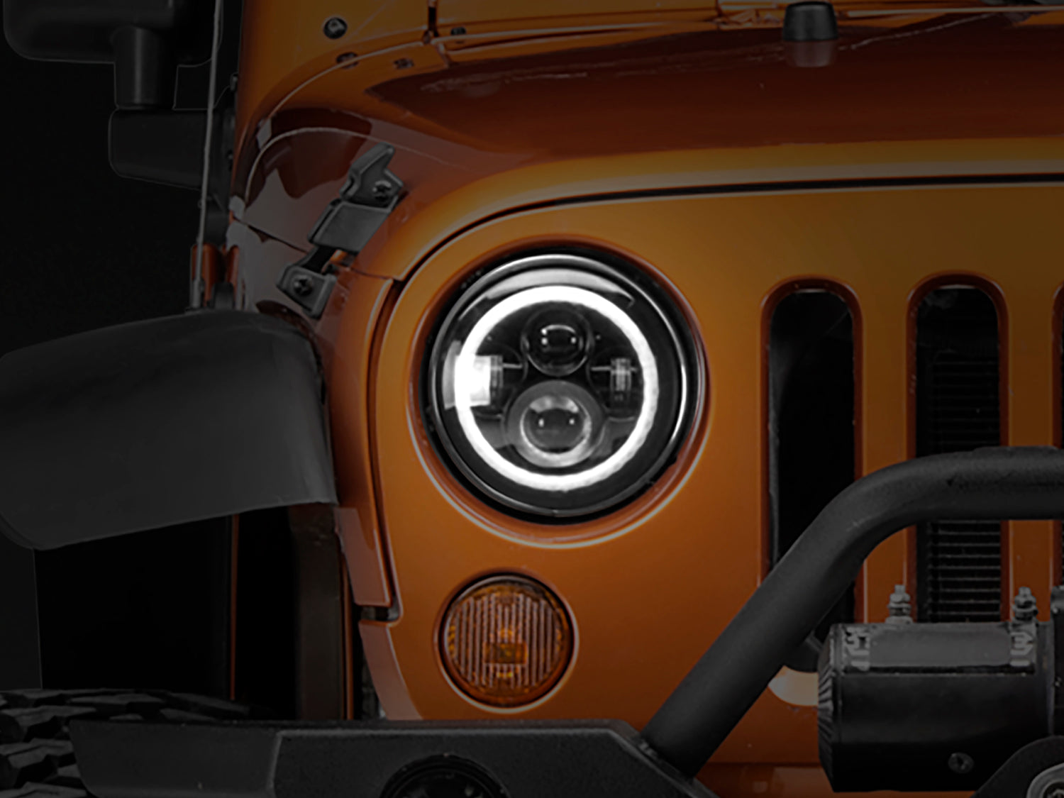 Upgrade the appearance and visibility of your Jeep Wrangler with a set of Axial LED Halo Headlights. These Axial Headlights feature a great looking integrated dual function accent halo. The halo functions as both a Day Time Running Light (DRL) and as a Turn Signal Indicator. The halo glows white as a DRL and amber when active as a turn signal. These Axial LED Headlights will certainly be much brighter than your stock headlights and feature a 6000K cool white color temperature. Featuring premium high output LEDs, these Axial Headlights out put 5400 lumens for the High Beams and 3600 lumens for the Low Beams. With a 60% lower power consumption than standard headlights, these LED Lights have a life span of up to 50,000 hours. Designed to perform in the harshest of elements, these Axial Headlights feature a rugged housing with a tough as nails clear polycarbonate lens. Each Headlight is epoxy sealed to prevent moisture from harming the state of the art electronics found inside. These Axial LED Headlights can take just about anything the trail can throw at them. With the included H4 - H13 wiring harness adapters (needed for 2007+ models) installation can be completed in under 30 minutes. It should be noted that the DRL/Turn Signal halo light will require additional wiring for operation. Installation instructions are included. These Axial 7-Inch Round LED Halo Headlights pass both DOT (U.S. Department of Transportation) certification and SAE (Society of Automotive Engineers) certification requirements making legal for street use. These aftermarket LED Headlights are intended for use with factory halogen headlight equipped models. In order to use these aftermarket LED Headlights on a Jeep that is already factory equipped with LED headlights, you will require a set of factory halogen headlight buckets – not included.