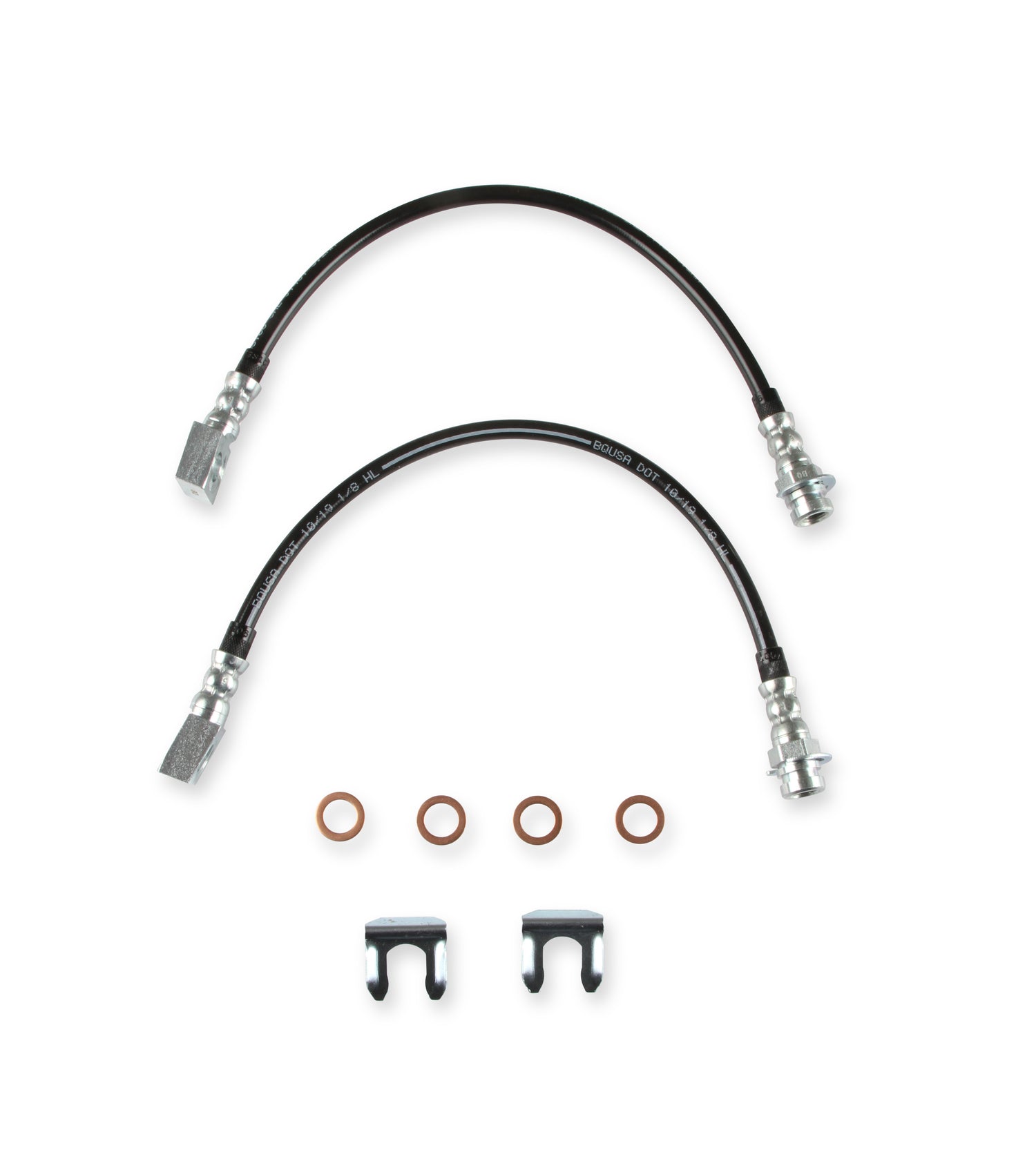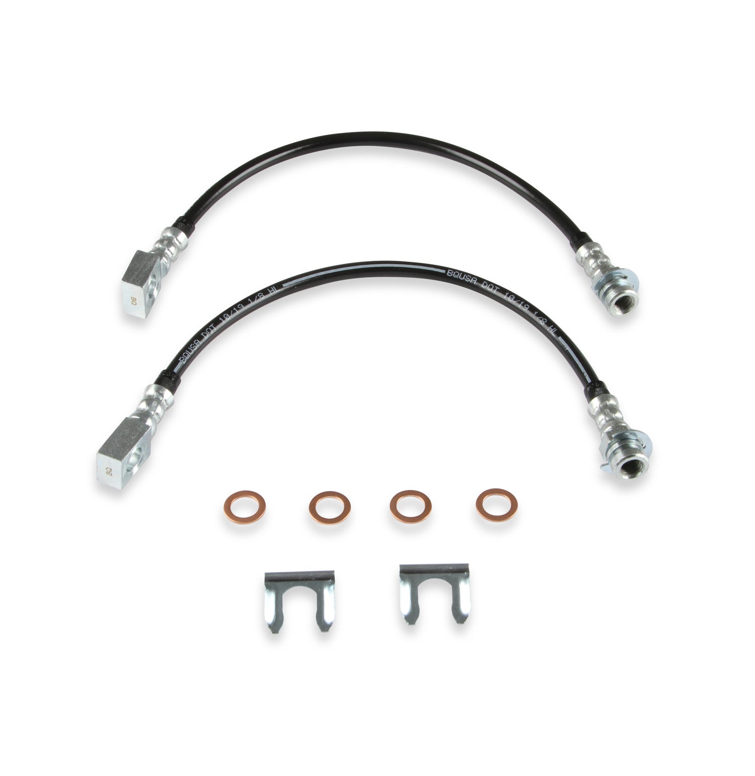 - Includes: (2) Brake Hoses, 2 Mounting Clips, and (4) 7/16" Crush Washers