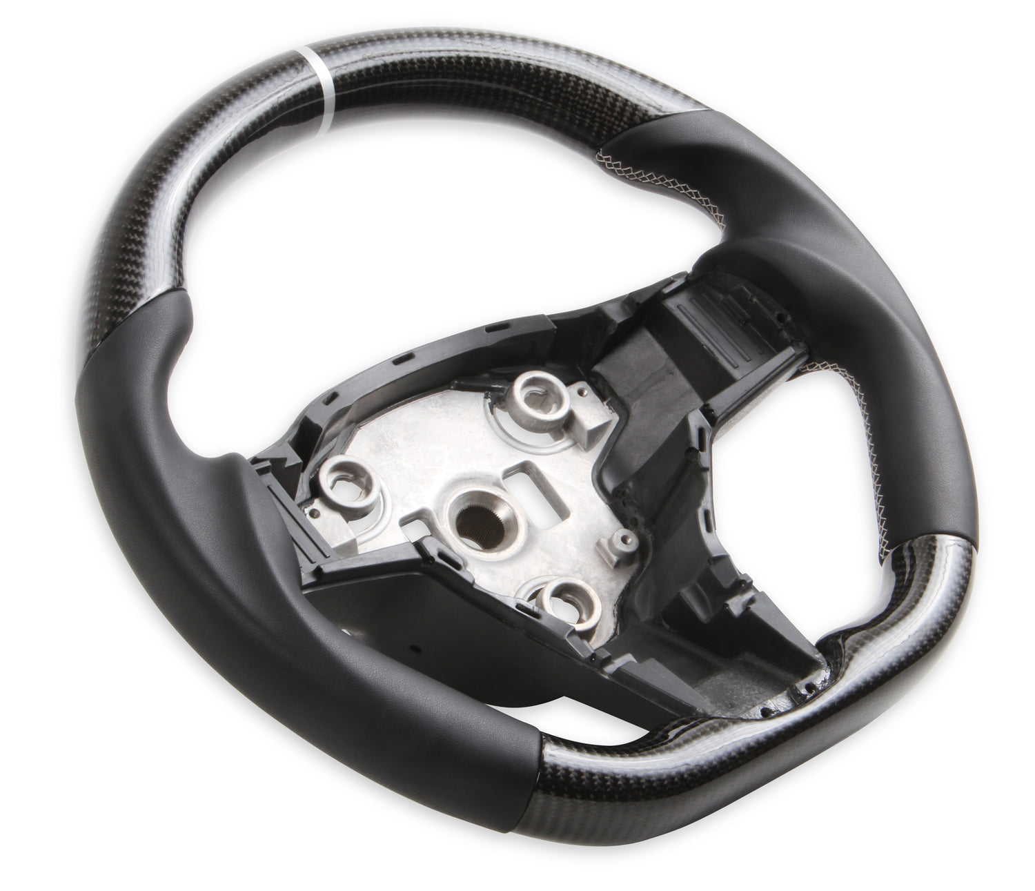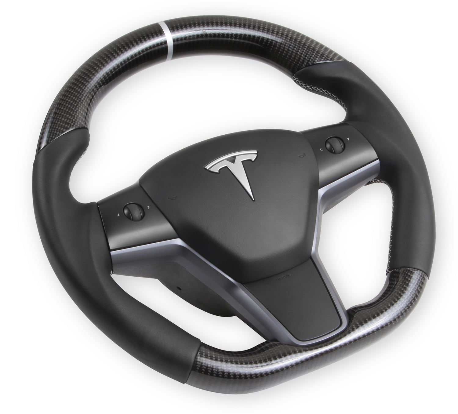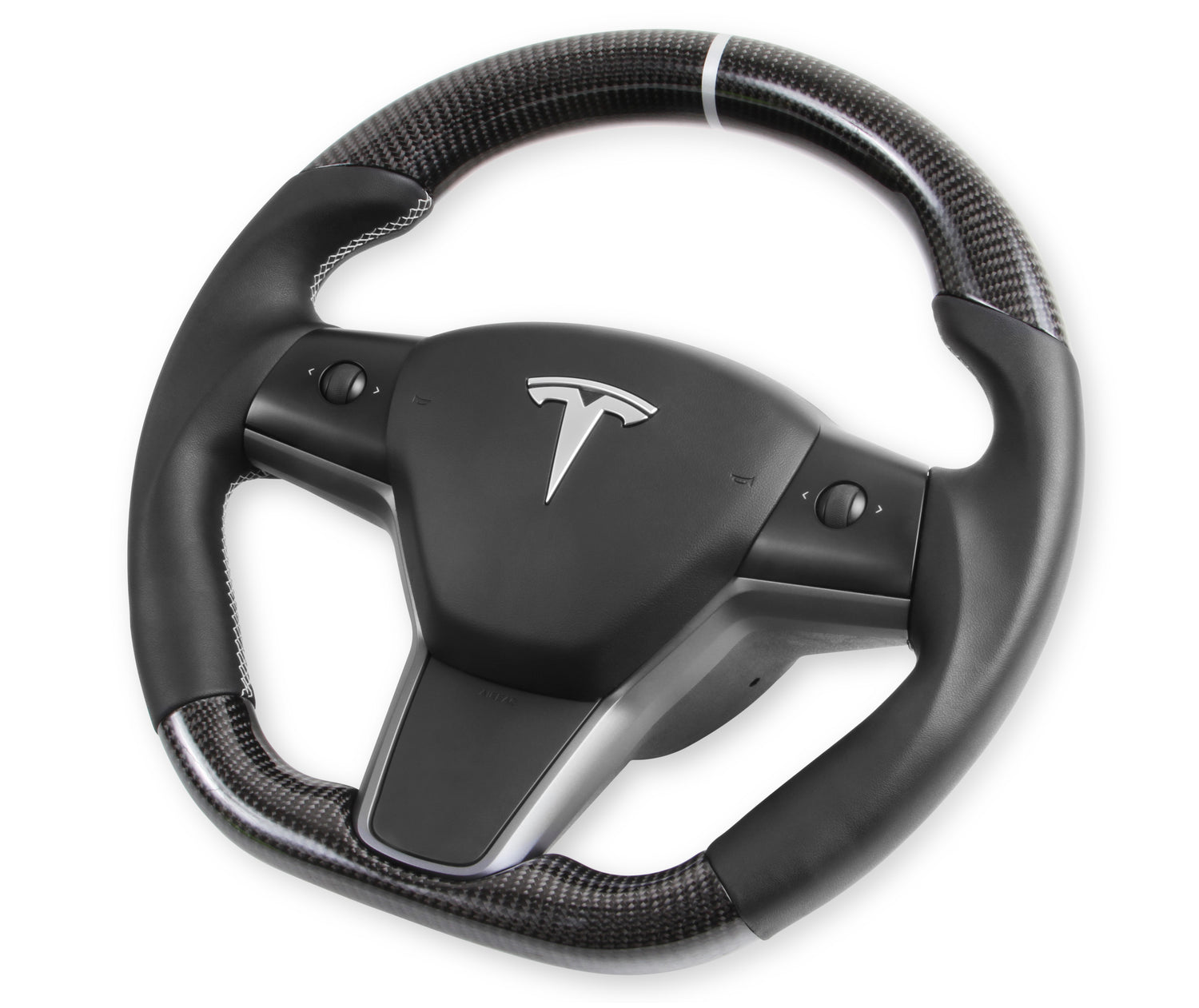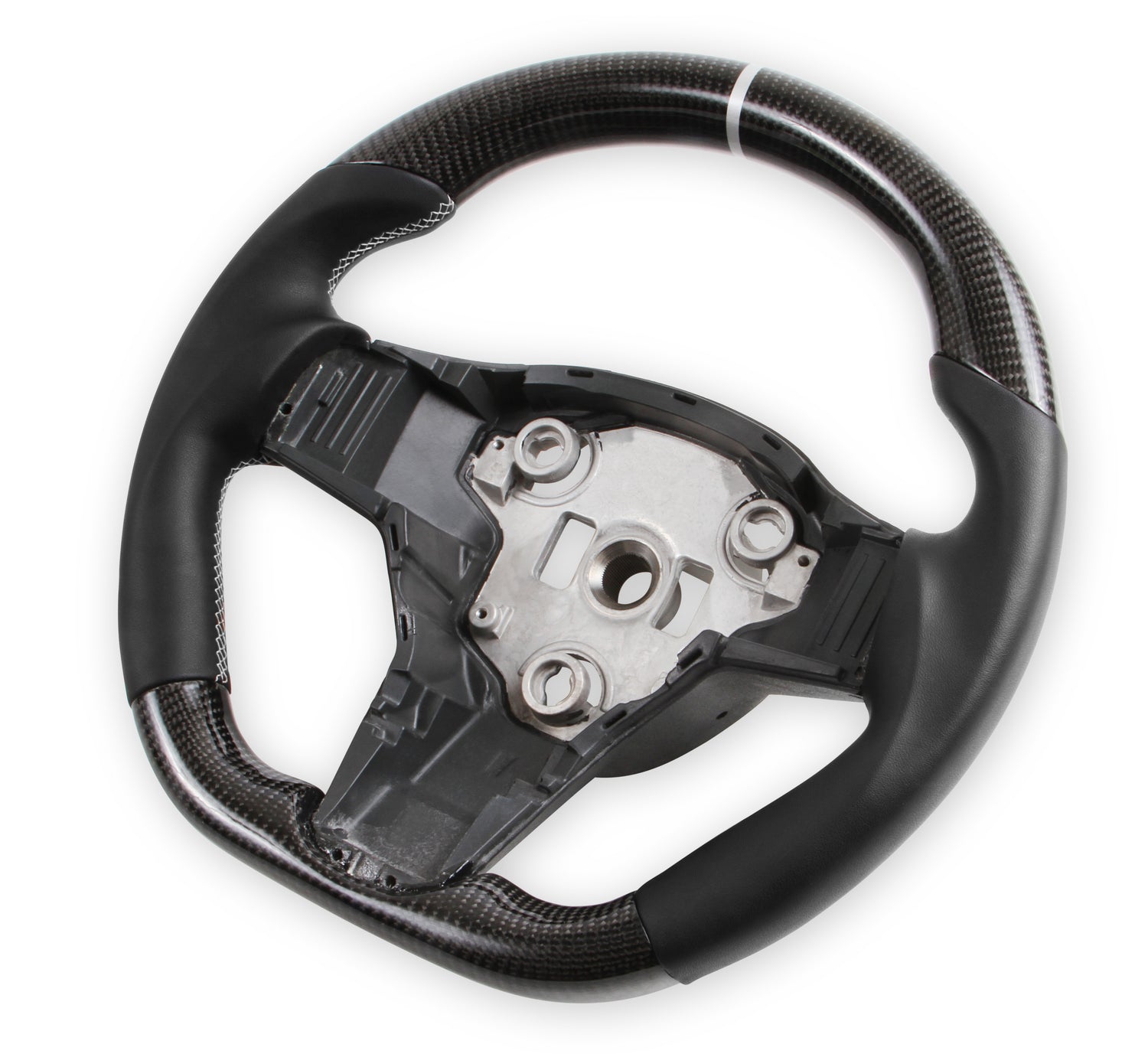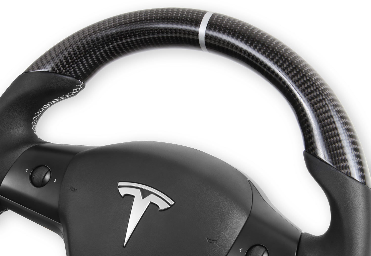 Steering Wheel - 14 in Diameter - D-Shaped - 3-Spoke - Carbon Fiber / Leather Grip - Black - Tesla 3 / Y 2017-21 - Each