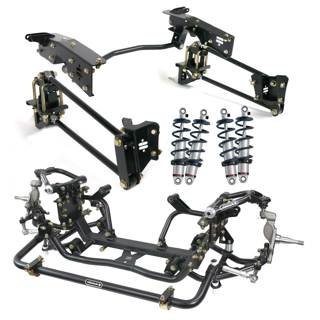 This system uses Ridetech coil-overs to provide adjustable suspension to your classic Ford. The coil-over system provide a small amount of adjustable ride height and easy to swap Hyperco springs for simple spring rate changes if needed. The system is designed to lower ride height by approximately 5 inch.