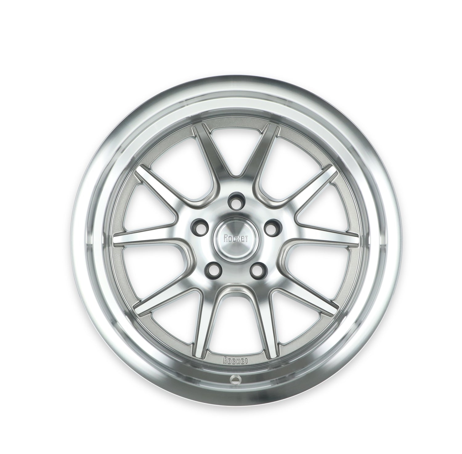 Features machined face and rim with titanium color accents and premium clear coating for low maintenance and show quality appearance. 1-piece design eliminates unwanted leaky bolts and maintenance of 3-piece wheels. Generous caliper clearance for performance braking systems. Includes 1.00 inch tall machined dome center cap with Rocket logo.