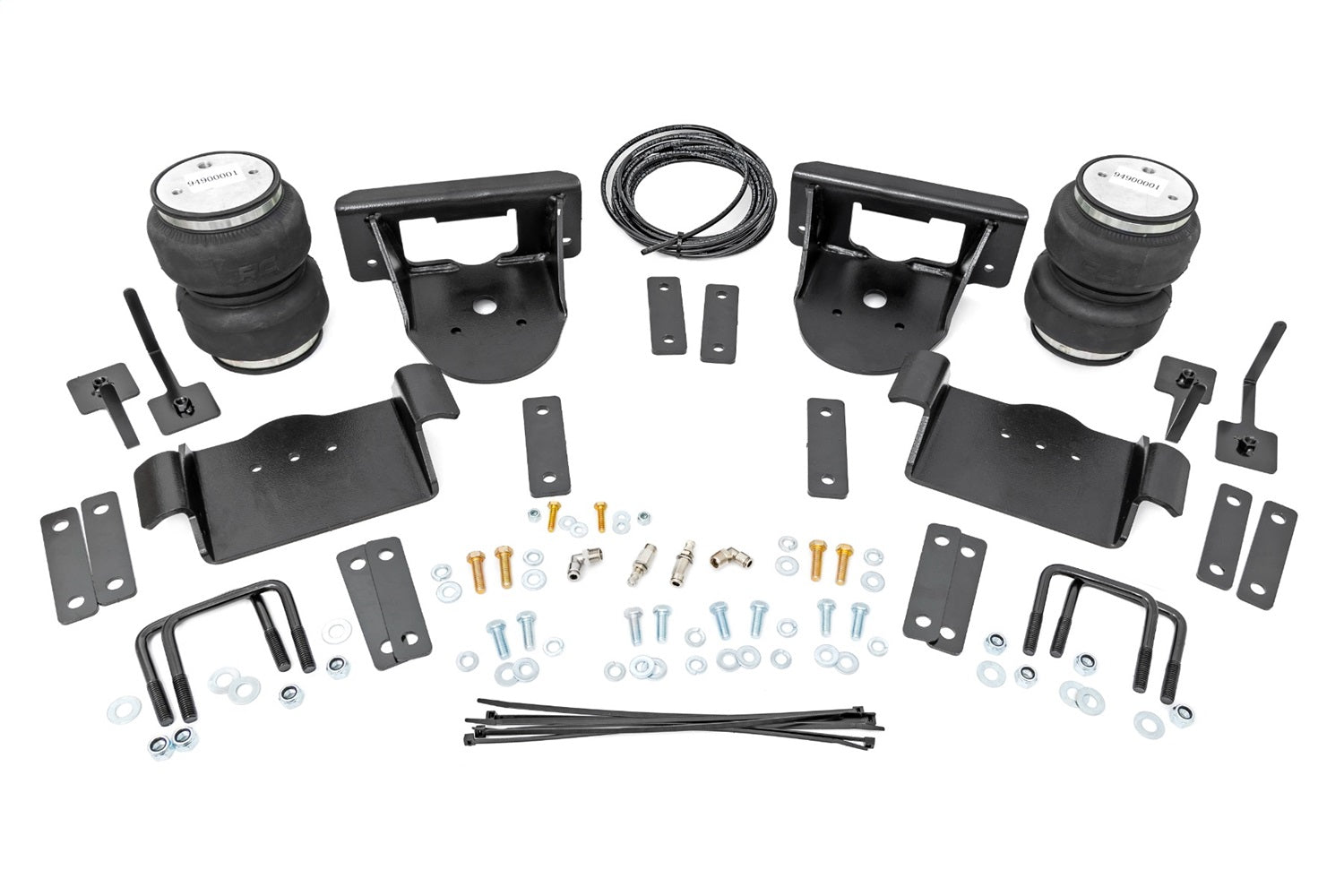 Ideal Leveling. Is your truck your workhorse? The main attraction to the pick-up line is the accessibility to haul and tow as desired. However, due to the amount of weight in the bed, or the condition of the vehicles rear leaf springs, this can cause the vehicle to be un-level when under load. Here at Rough Country, we created an innovative new product to ensure that these are troubles of the past. Introducing, Rough Countrys Rear Air Spring Kit. Heavy-duty Construction. Rough Countrys Rear Air Spring Kit features two RC branded high-quality double convoluted airbags complemented with DOT-approved airlines. Whether you plan on towing or hauling in the not-so-distant future Rough Countrys Air Spring kit is the must-have accessory to ensure that your trailer is level reducing the weight-off of the tongue of your trailer. Each kit offers 1/4 in. push connector fittings and all of the bracketry needed to ensure installation is lightning fast and secure! Rough Countrys Air Spring kit provides up to 5,000 lbs. of load support to ensure that you experience less sway and bottoming out when braking and steering! Installation. With an estimated timeframe of 1-2 hours this full kit can be installed at home using standard tools and can be completed efficiently and quickly! Limited Lifetime Replacement Warranty. Rough Countrys Rear Air Spring Kit is backed with a limited lifetime replacement warranty towards manufacturer defects. As such, the product is protected from structural and workmanship damage after the date of purchase. With our industry-leading warranty give yourself peace of mind when using Rough Countrys Suspension products!