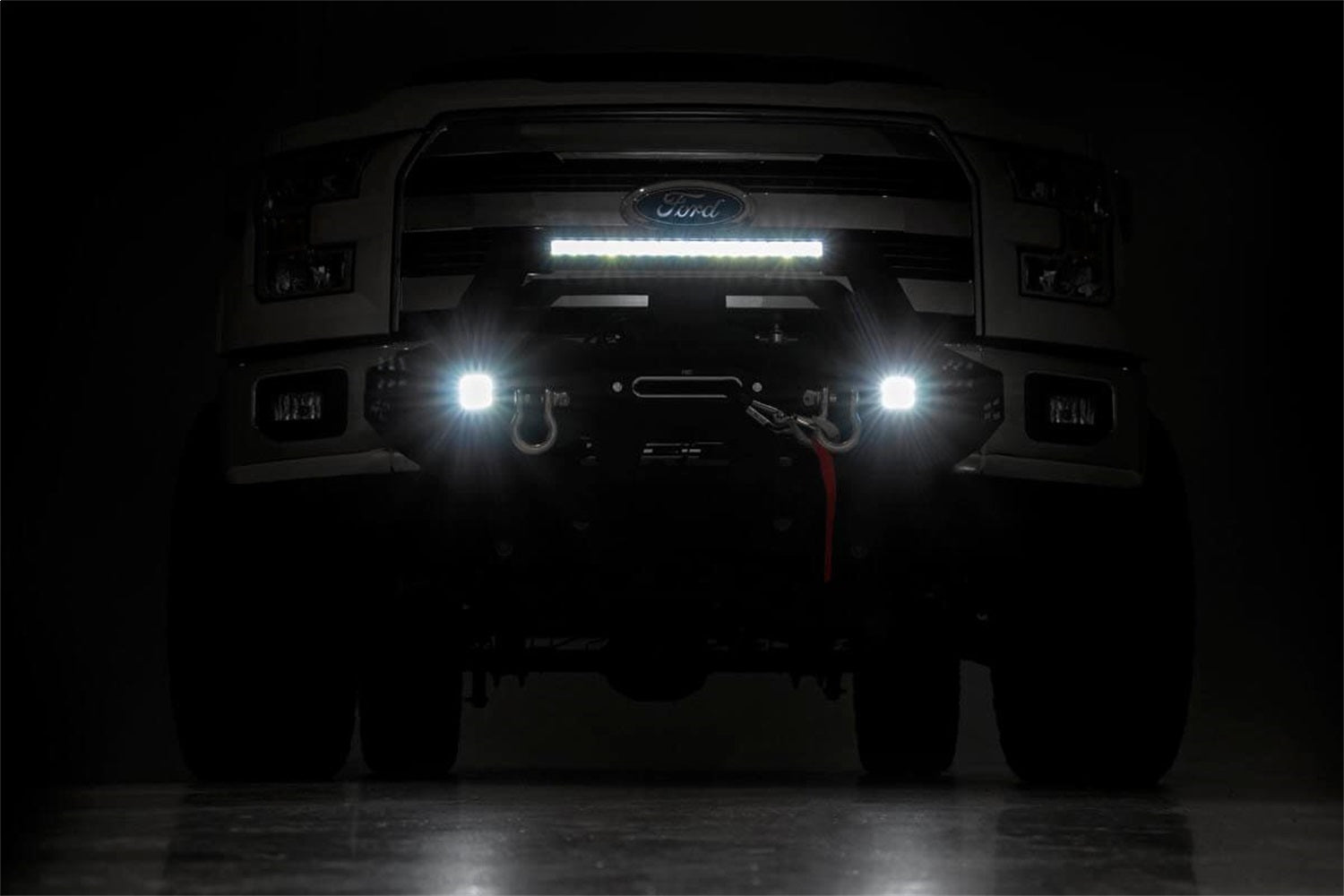 Add a professional recovery and lighting solution to your vehicle with Rough Countrys EXO Winch Mount System for Ford F-150. This innovative recovery solution bolts-on right over the factory bumper, giving your truck a wealth of new abilities and aggressive good looks.Rough Countrys EXO Winch Mount System features a 20in Black Series Single-Row LED Light bar and two Flush Mount Black-Series LED Cubes for incredible off-road illumination. A rugged 1/4in thick steel Winch mount can fit any standard-sized Winch while a set of reinforced d-rings offer the perfect recovery point to get you out of any jam.Best of all, this kit is easy to install, with a 100% bolt-on installation process thats simple enough to do in any home garage and can be fully returned to stock at any time. Upgrade your truck with Rough Countrys EXO Winch Mount System and gain incredible recovery and lighting power in an instant!