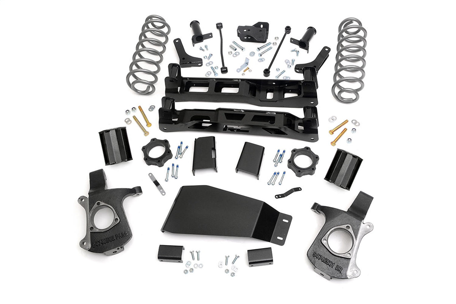 GMC's 2019 Sierra 1500 features an impressive all-new design that's built from the ground up, with aggressive angles and head-turning stylings that fit in beautifully when transformed with Rough Country's 6in Suspension Lift. This kit lifts and levels your vehicle for a commanding stance and enough clearance to run 35x12.50 tires on 10in wide wheels. Rough Country has engineered this kit to provide optimal suspension geometry while retaining the factory ride quality, giving you enhanced off-road capabilities without sacrificing the handling and smooth ride that makes this truck so impressive. Rough Country's 6in Suspension lift retains the stock track width, allowing for up to a 10in wide wheel with 4.5in backspacing. Each kit includes front and rear crossmembers and a skid plate for enhanced chassis strength as well as cast steel knuckles for incredible durability and performance. Includes Rough Country's Lifetime Replacement Guarantee!