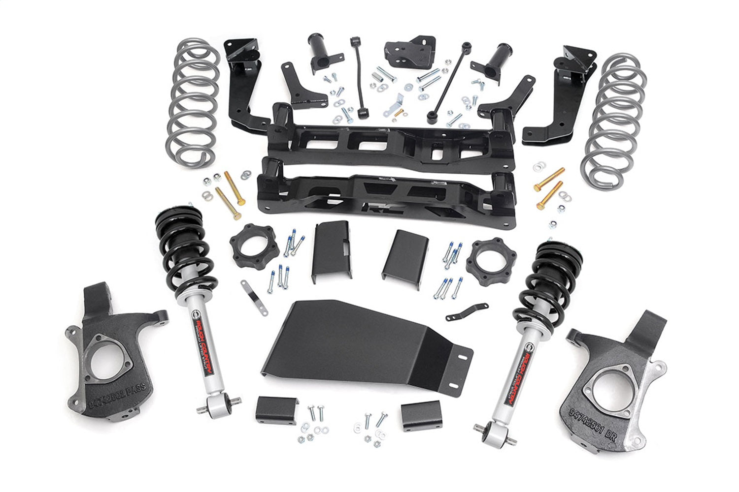 This all-inclusive kit ships with everything you need to get going and hit the mudholes. Featuring a set of beefy lifted knuckles and 1/4in thick steel front and rear high-clearance crossmembers, this kit offers plenty of muscle to handle hazards both on and off-road. A set of Lifted Coil Springs and Upper Strut Spacers provide plenty of ride height - enough to run up to a 33in tire on our 5in option, or a 35in tire on our 7in option. Both kits feature sway-bar links, shock extensions, brake line brackets, a rough and tumble lower skid plate, and Grade 8 Hardware. Included sway-bar drop brackets and differential drop brackets help keep vehicle components properly aligned after lifting, providing a factory-like ride while boasting an aggressive stance.