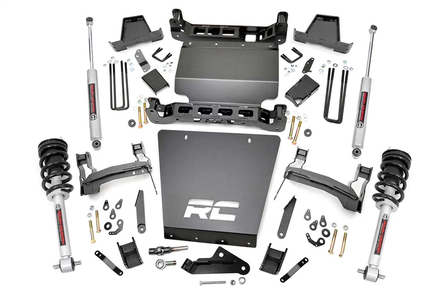 What better way to deck out that brand new 2014-up GM 1500 you worked so hard for than with the aggressive stance and jaw-dropping ride height of Rough Countrys brand-new 7- in. Suspension Lift for 2014-up Chevy / GMC 1500 Pickups? This massive lift is designed to retain your stock track width! This affords your truck the ability to run up to an impressive 35- in. tire on factory 20- in. wheels, and gives you a nearly limitless choice in aftermarket wheels and tires that other kits just cant fit. This kit ships with EVERYTHING you need to give your new truck the aggressive stance and capabilities it deserves; Stout upper strut spacers, a beefy front and rear skid plate, our Heavy Duty Front and Rear Crossmembers, and a set of differential and sway-bar drop brackets - all designed by our in-house Research and Development team with 100% laser-cut materials for the best possible fit on your vehicle. This whopping 7- in. Lift also comes with a set of rear 6- in. fabricated anti-wrap lift blocks that offer a huge boost while helping combat dreaded axle wrap issues on inferior big lifts. Also included are a set of our Nitrogen charged N3 Shocks! Offering the best in balanced performance for on and off-road use, these shocks feature a 10-stage velocity sensitive valving custom tuned for this specific application. That means these shocks are specifically valved for use with this vehicle and lift combo, giving you unparalleled performance for any driving situation.