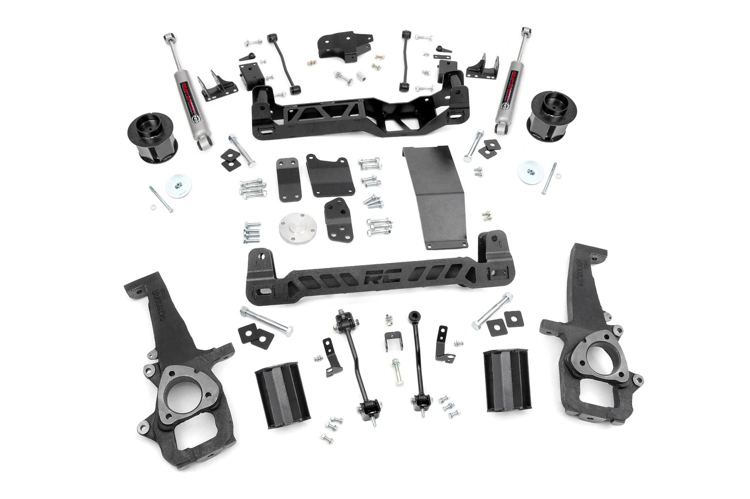 Give your RAM 1500 the perfect blend of performance, protection, and style with Rough Country's 6-inch Suspension Lift. Designed to offer an affordable way to maximize off-road performance and run up to 37-inch tires, these kits offer high quality, heavy-duty equipment for new model RAM 1500's.Utilizing heavy-duty, laser cut, steel equipment engineered by Rough Country, these 6-inch Suspension Lifts are complete kits that include everything needed for outstanding off-road performance. High-clearance front and rear cross-members provide enough room for off-road climbs and runs. A heavy-duty skid plate shields the vehicle's differential, protecting you from hazardous terrain. A durable set of driver and passenger side lifted cast knuckles are also included, helping to promote proper geometry once the vehicle is lifted. For true trailblazers, this kit also ships with a set of rear N3 Nitrogen-charged shock absorbers - valved specifically for a blend of on and off-road performance. Includes Rough Country's Lifetime Replacement Guarantee!