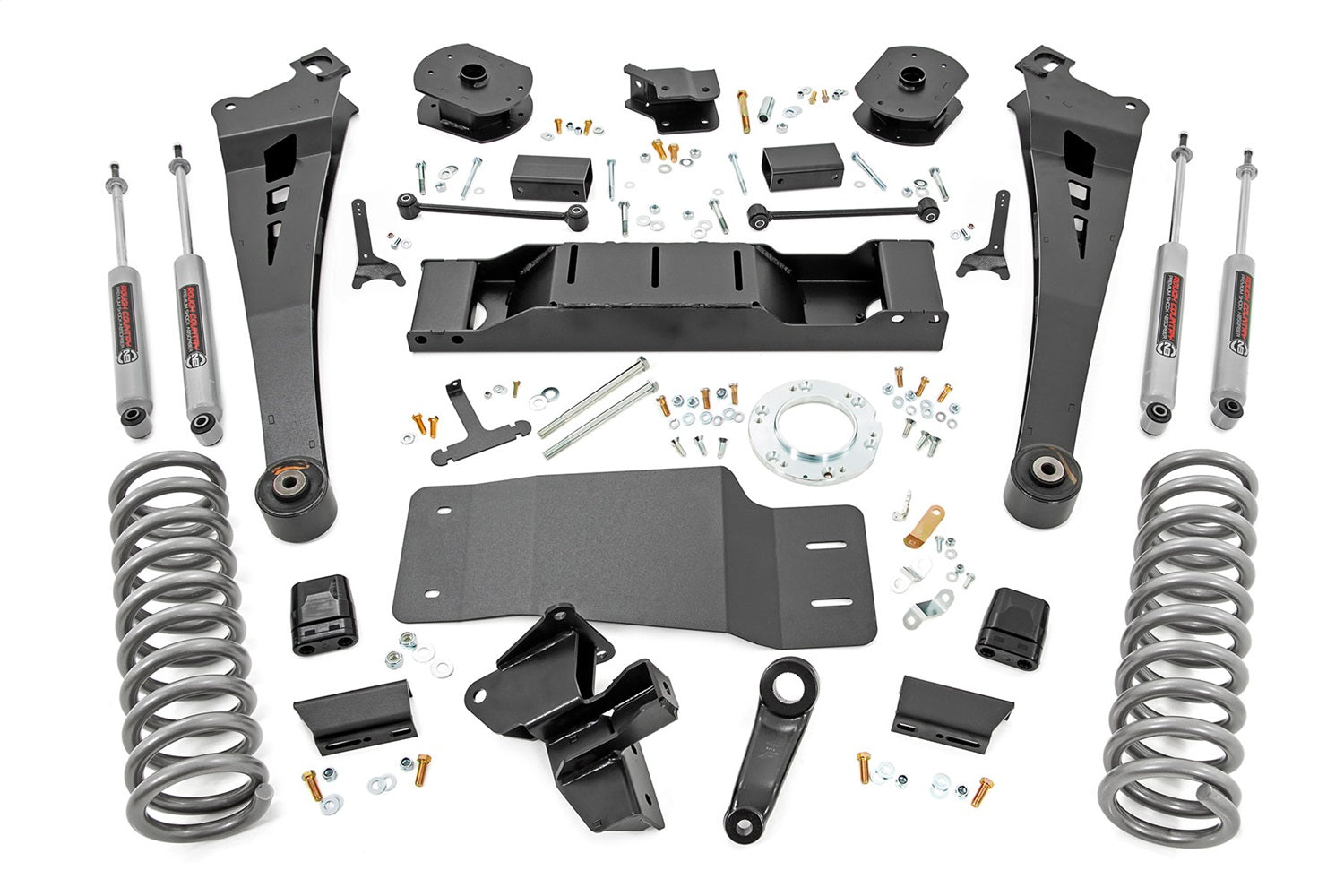 Compliment your RAM 2500's aggressive, good looks with Rough Country's new 5-inch Lift Kit with lifted coil springs. New model RAM Trucks come with a wealth of impressive features right from the factory. Rough Country's new 5-inch kit was engineered to retain these impressive factory specs while bumping up performance and durability where it's needed most. The result is a lifted beast with a mean profile and lush ride-quality that'll make other RAM owners wonder where you got yours from! When changing a vehicle's suspension, the key to preserving ride quality is in keeping the geometry of all suspension components as close to their factory angles as possible. Rough Country's new 5-inch Suspension kit features a set of ultra-durable Radius Arms, precision fit to bolt right into the factory mounts for an easier install and a more factory-like angle. These beefy, upgraded Radius Arms also feature a durable, durable rubber bushings for maximum vibration absorption. This kit also includes a skid plate and a set of front, lifted coil springs for unparalleled ride quality from your lifted Dodge Ram.