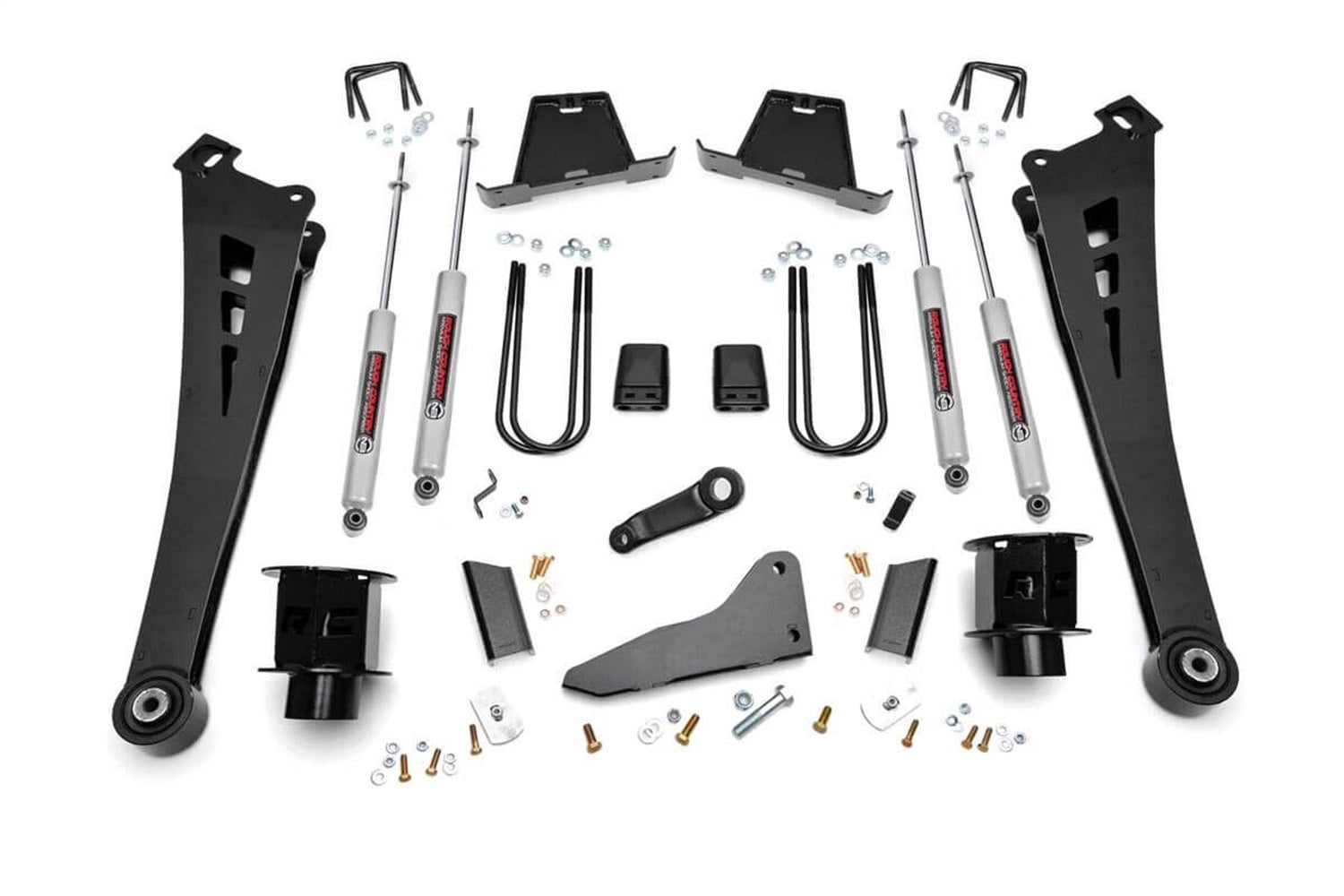Complement your RAM 3500's aggressive, good looks with Rough Country's new 5-inch Lift Kit. New model RAM Trucks come with a wealth of impressive features right from the factory. Rough Country's new 5-inch kit was engineered to retain these impressive factory specs while bumping up performance and durability where it's needed most. The result is an aggressive, lifted beast with an mean profile and lush ride-quality that'll make other RAM owners wonder where you got yours from! When changing a vehicle's suspension, the key to preserving ride quality is in keeping the geometry of all suspension components as close to their factory angles as possible. Rough Country's new 5-inch Suspension kit features a set of ultra-durable Radius Arms, precision fit to bolt right into the factory mounts for an easier install and a more factory-like angle. These beefy, upgraded Radius Arms also feature a durable, durable rubber bushings for maximum vibration absorption. In a further effort to preserve the truck's factory ride, this kit retains the factory progressive rate coil spring -- designed by Dodge specifically for the weight and ride quality of these new model trucks. Get the look you really want for your truck with an easy-to-install kit, at an incredible price!