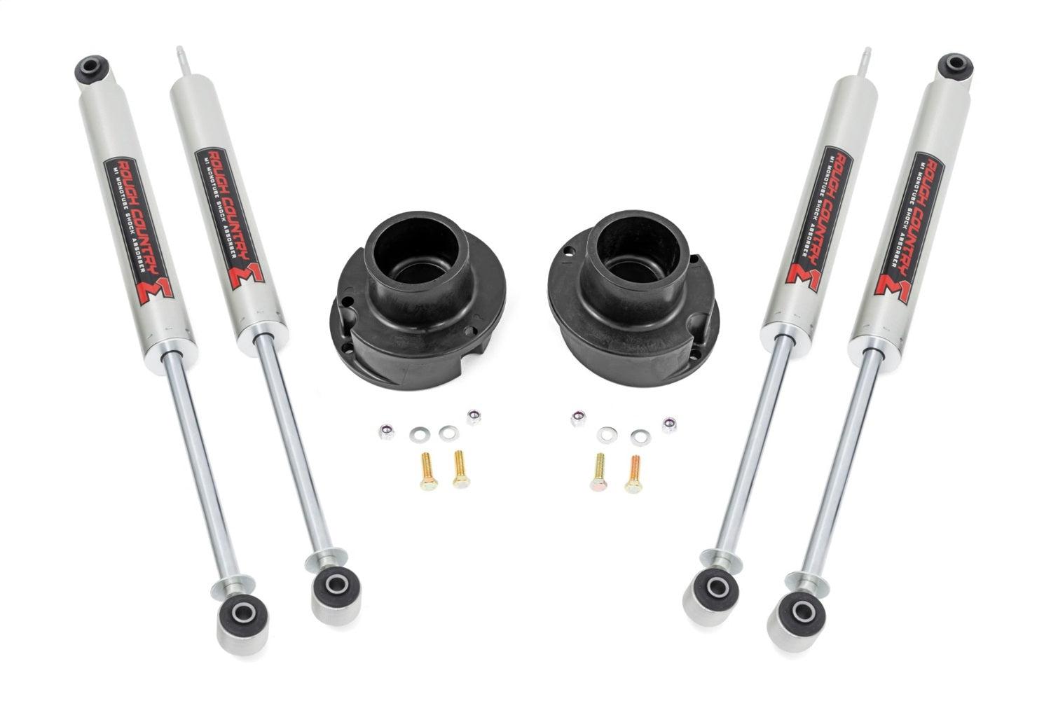 Lift, level, and smooth out your ride with Rough Country's new and improved 2.5-inch RAM 2500/3500 Leveling Kit. Engineered to fit RAM trucks equipped with front radius arm suspension setups, this easy-to-install kit gives a big boost at an unbelievable price! Rough Country's durable coil spring spacers have been expertly redesigned to match the factory geometry of your truck, including the angle of the coil mounts and position of the rubber isolator, which perfectly indexes both springs to eliminate any chance of coil bowing. This kit also includes a pair of front N3 Shock Absorbers for better ride quality both on and off-road. Rough Country's N3 shocks are nitrogen charged, featuring 10-Stage Velocity Sensitive Valving for a smooth ride no matter what the terrain. This kit also features a lightning fast, 100% bolt-on installation process that couldn't be easier or less invasive to your new vehicle. Includes Rough Country's Lifetime Replacement Warranty.