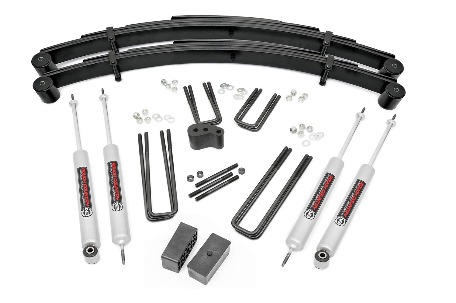 Give your 77-79 Ford Super Duty an impressive upgrade, front to back with Rough Countrys 4 in. Ford Suspension Lift Kit! This easy-to-install lift kit raises increases your ground clearance to avoid any obstacles and provides a better-than-stock look that gives an improved ride height and more aggressive appearance. This kit features a set of front, lifted leaf springs allowing you gain additional ride height without sacrificing ride quality or performance. A raised steering block and all necessary hardware is provided to keep everything at optimum angles for a factory-like ride, even after lifting. A set of Rough Countrys premium N3 shocks are also included. These fine tuned 10-stage variable high-pressure Nitrogen charged shocks offer a fantastic blend of off-road action and smooth highway ride quality. With a durable 18mm spring-loaded piston rod and faster-cooling 54mm shock body. Rough Countrys 4 in. Ford Suspension Lift Kit comes with everything you need to fit up to a 35 in. tire with proper wheel backspacing. Best of all, Rough Countrys 4' Ford Suspension Lift Kit is backed by our Lifetime Replacement Warranty.