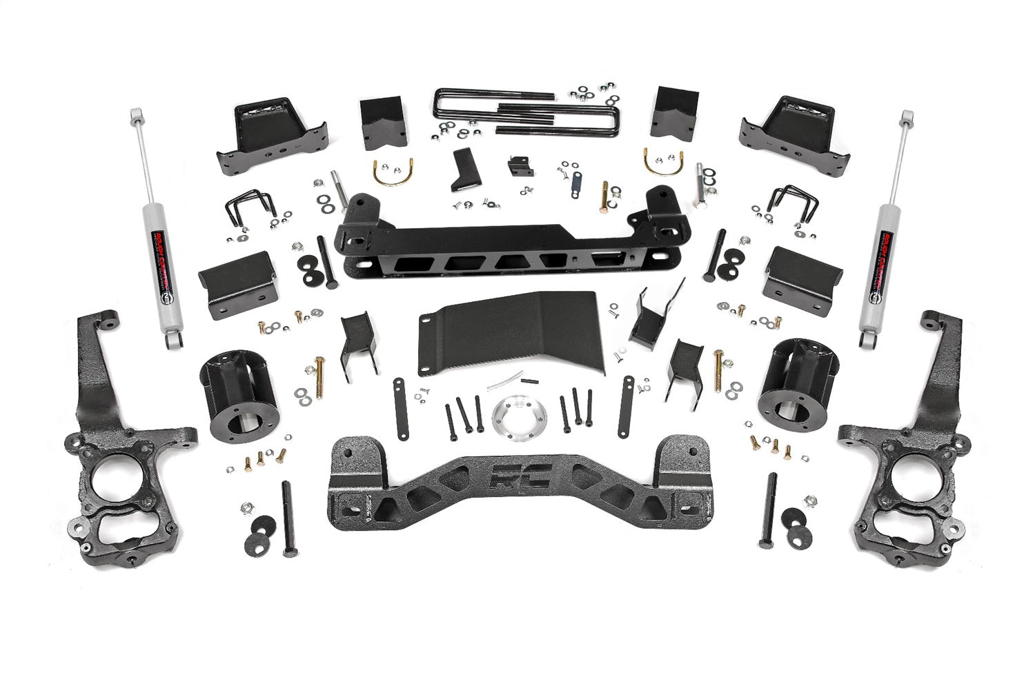Give your Ford F-150 an aggressive new look and unparalleled off-road performance with Rough Country's 6-inch Suspension Lift. This all-inclusive kit features everything needed to take your Ford off the freeway and into the fields. Featuring a set of durable lifted knuckles and strut spacers, you'll gain enough ride height to run up to 35-inch tires with proper wheel spacing! A set of differential drop brackets, sway-bar drop brackets, brake line brackets, and a drive shaft spacer help keep everything at optimum angles for a factory-like ride, even after lifting. A 1/4-inch thick plate steel front and rear crossmember bring uncompromised strength and good looks to your truck, and are updated to fit the new F-150 design. Our Fabricated Rear Blocks offer considerably more strength than their cast iron counterparts, and were specifically engineered by Rough Country to prevent against axle-wrap. A set of Rough Country's premium N3 shocks are also included in this kit, featuring a large diameter body with a chrome-hardened piston rod and long-lasting polyurethane bushings. Best of all, Rough Country's Ford F-150 Lift Kit is backed by our Lifetime Replacement Warranty.