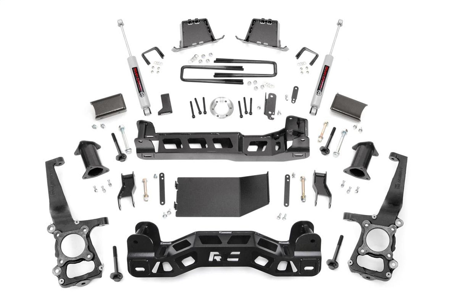 Give your '11 - '13 Ford F-150 an aggressive new look and unparalleled off-road performance with Rough Country's 6-inch Suspension Lift. This all-inclusive kit features everything needed to take your Ford off the freeway and into the fields. Featuring a set of durable lifted knuckles and strut spacers, you'll gain enough ride height to run up to 35-inch tires! A set of differential drop brackets, sway-bar drop brackets, brake line brackets, and a drive shaft spacer help keep everything at an optimum angle for a factory-like ride, even after lifting. A 1/4-inch thick plate steel front and rear cross member bring uncompromised strength and good looks to your truck, featuring a laser-cut "RCX" logo and an easy-to-install design. Our 4-inch Fabricated Rear Blocks offer considerably more strength than their cast iron counterparts, and were specifically engineered by Rough Country to prevent against axle-wrap. Improve your on and off-road ride quality with Rough Country's premium N3 shocks! These 10-stage variable valving, high-pressure Nitrogen charged shocks offer a fantastic blend of off-road action and smooth highway ride quality. With a durable 18mm spring-loaded piston rod and faster-cooling 54mm shock body, this shock offers up to 36kN Tensile Strength for a long lifespan of impressive vibration dampening.