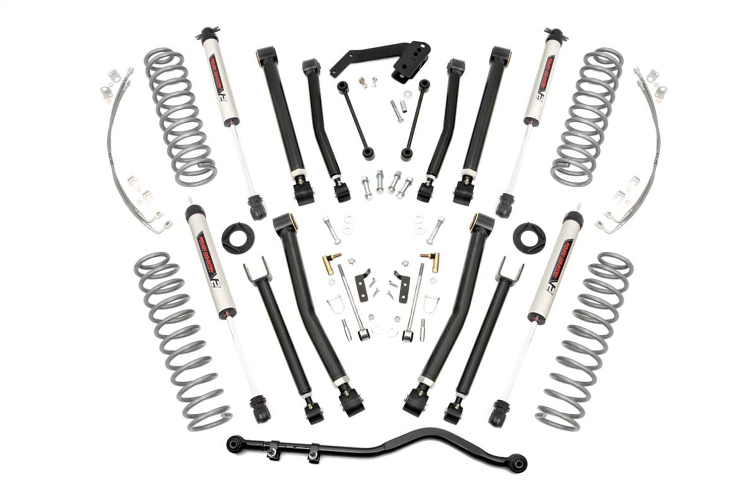 Give your Jeep a total transformation with Rough Country's 4in X-Series Suspension Lift. This all-inclusive kit comes with everything you need to give your vehicle aggressive good looks and improved off-road performance! This kit features a set of front and rear upper and lower adjustable control arms with a high-clearance design, allowing you to dial in the exact ride you desire! Each kit also comes with lifted coil springs and coil correction plates, providing lift height and impeccable vibration dampening on any terrain. For those who are serious about flexing, crawling, and pushing your Jeep to the limits, this kit features an upgraded Forged Adjustable Track Bar. Made of forged steel, this 16lb Track Bar boast a beefy construction that will dwarf stock equipment. Easy to install and fully adjustable on the vehicle. Best of all, this kit features Rough Country's premium V2 Monotube shocks! These 10-stage variable valving, high-pressure Nitrogen charged shocks offer a fantastic blend of off-road action and smooth highway ride quality. With a durable 18mm spring-loaded piston rod and faster-cooling 54mm shock body, this shock offers up to 36kN Tensile Strength for a long lifespan of impressive vibration dampening. Features natural rubber bushings and an eye-catching metallic silver paint.