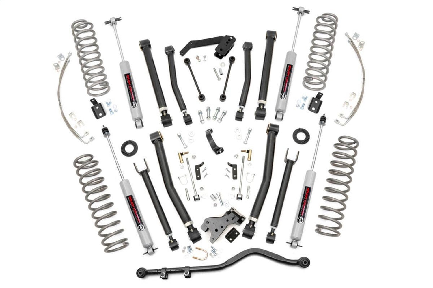 Give your Jeep a total transformation with Rough Countrys 6in X-Series Suspension Lift. This all-inclusive kit comes with everything you need to give your vehicle aggressive good looks and improved off-road performance! This kit features a set of front and rear upper and lower adjustable control arms with a high-clearance design, allowing you to dial in the exact ride you desire! Each kit also comes with lifted coil springs and coil correction plates, providing lift height and impeccable vibration dampening on any terrain. For those who are serious about flexing, crawling, and pushing your Jeep to the limits, this kit features an upgraded Forged Adjustable Track Bar. Made of forged steel, this 16lb Track Bar boast a beefy construction that will dwarf stock equipment. Easy to install and fully adjustable on the vehicle. Best of all, this kit features Rough Countrys premium N3 shocks! These 10-stage variable valving, high-pressure Nitrogen charged shocks offer a fantastic blend of off-road action and smooth highway ride quality. With a durable 18mm spring-loaded piston rod and faster-cooling 54mm shock body, this shock offers up to 36kN Tensile Strength for a long lifespan of impressive vibration dampening. Features natural rubber bushings and an eye-catching metallic silver paint.