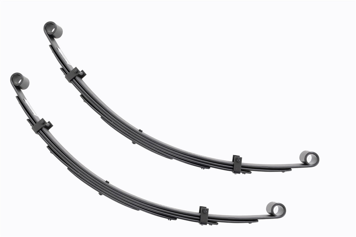 Added Lift Height and Ride Comfort. Take your suspension kit to the next level with Rough Country's Replacement Leaf Springs. Constructed from high-quality materials and designed specifically for the weight of your vehicle. This enhanced replacement spring will provide a factory-like feel while retaining your suspension lift height. Durable and Off-Road Ready. Rough Country's Replacement Leaf Springs are designed to tackle any terrain that they are faced with. Featuring a multi-leaf design and spring pads this reduces the friction and maximizes comfort. Each leaf pack utilizes tapered leaves for improved flexibility at their ends. Installation. Rough Country's Replacement Leaf Springs offer a 100% bolt-on installation estimated to take approximately 1-2 hours depending on vehicle condition. Simply remove the pre-existing leaf spring and use the stock hardware to equip your vehicle with this high-quality replacement. Lifetime Replacement Warranty. Rough Country's Replacement Leaf is backed with a 5-year replacement warranty towards manufacturer defects. As such, the product is protected from structural and workmanship damage after the date of purchase. With our industry-leading warranty give yourself peace of mind when using Rough Country's Suspension products!
