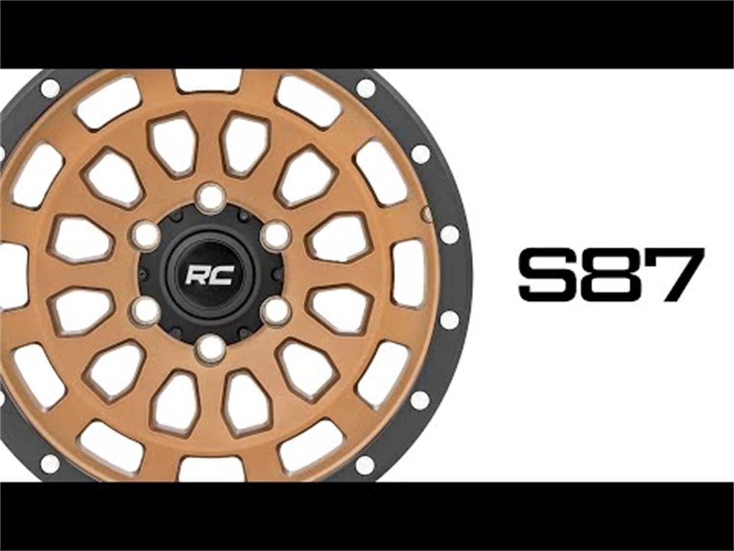 Stand-out Look. Rough Country 87 Series Bronze Wheels are built for maximum durability and strength with high-performance styling that ensures that it's ready to withstand anything on the street. Opting to upgrade your stock wheels will provide you with a rugged appearance and outstanding performance that you expect from Rough Country products. The 87 Series bronze Wheel is a must for anybody who wants to add a bold new look to make your ride stand out from the crowd. Superior Design. Our Series 87 bronze Wheels feature a high-quality bronze finish with matte black simulated bead lock and one-piece aluminum construction that delivers a strong, durable wheel. These copper color wheels boast an aggressive design and include a Rough Country black center cap, so you can tackle the road in style. Rough Country's Copper Wheels come with a 1-year finish and Limited Lifetime Structural Warranty.