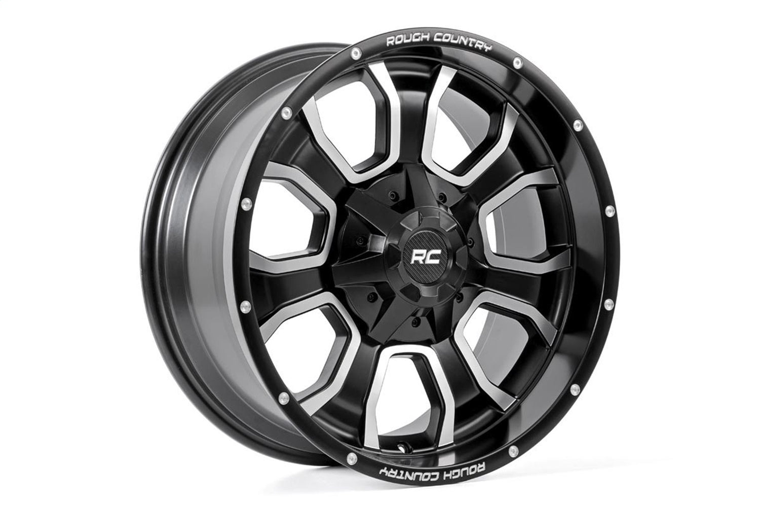 Set yourself apart from the pack with Rough Country's One-Piece Series 93 Wheels. This 7-spoke black and machined wheel offers an incredible look that's sure to turn heads. This one-of-a-kind wheel features 7 spokes that flare out near the lip for a dramatic visual style that's perfect for any lifted vehicle. This stylish wheel features a gloss black coat with machined accents that pop under any truck or Jeep. Rough Country's Series 93 is a one-piece wheel design, constructed from a single piece of heavy-duty aluminum for the optimal balance of weight and performance. Each Series 93 Wheel includes dual machined "Rough Country" logos and a center cap with RC carbon fiber logo design and includes a limited lifetime warranty.
