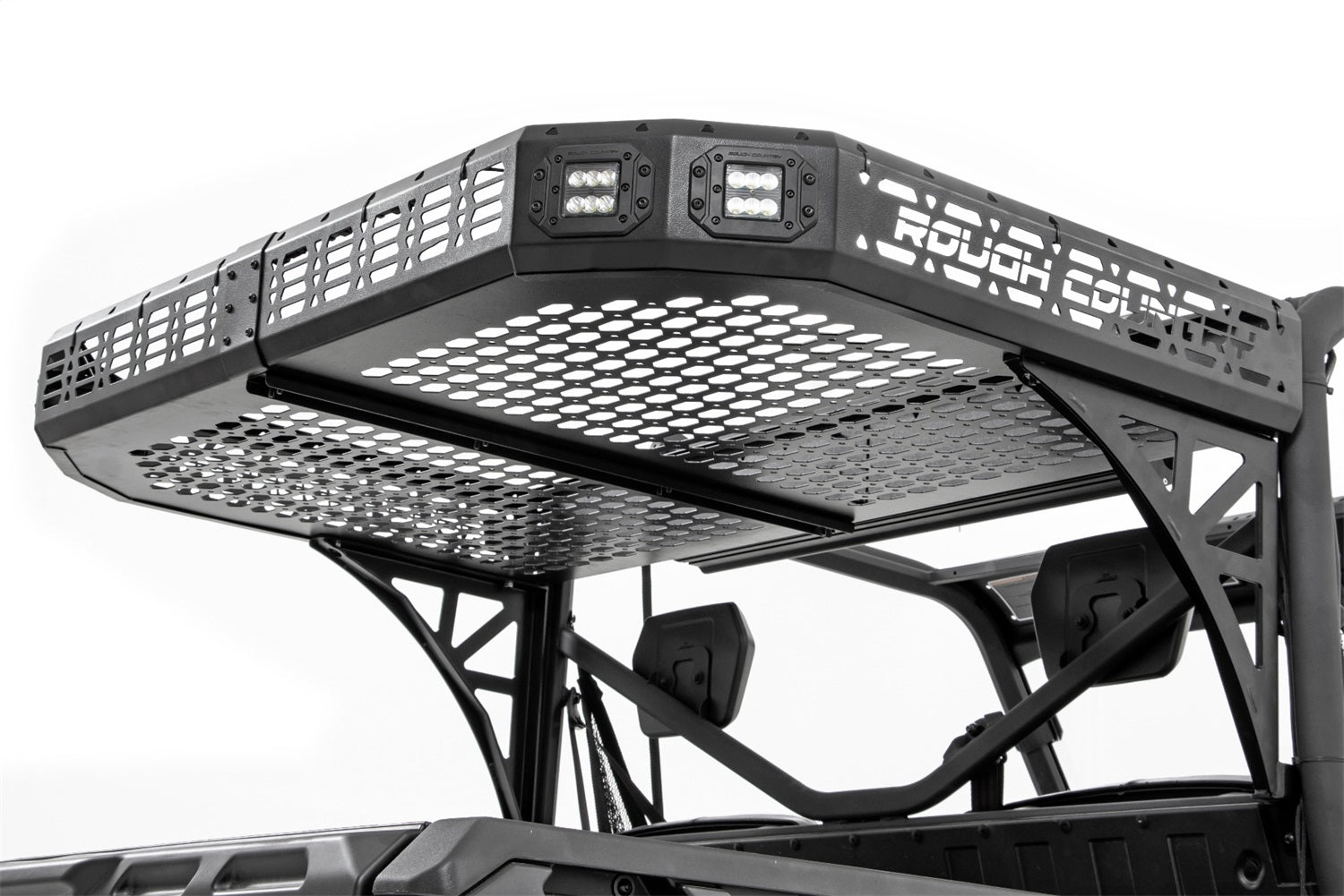 Overland adventures require bringing plenty of gear along for the ride. Ensure that your Can-Am Defender has plenty of cargo space by installing Rough Countrys rear cargo rack kit. This rock-solid rack design can provide storage to haul all of your gear without sacrificing your beds space or dumping capabilities. Rough Countrys cargo rack kit is constructed from heavy-duty steel and features a laser-cut mesh pattern that provides plenty of mounting points to secure your load. Since adventure doesnt end when the sun goes down, four flush mount led lights are an available option. Installation is easy; all needed hardware is included and only requires some minor drilling. The kit, coated in a durable black powder coat finish, will give you years of protection to the harshest elements.