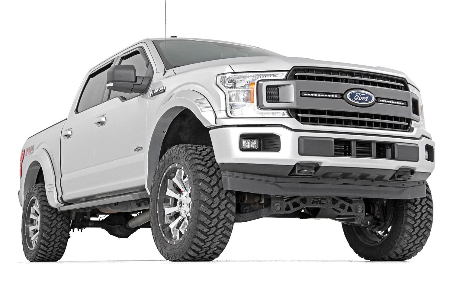 Rough Country's SF1 Fender Flares help you get the tough-looking finishing touch that your build deserves with a one-of-a-kind design. These flares complement the truck's body lines offering a clean look that will turn heads. The SF1 flare design gives the perfect amount of additional tire coverage for an oversized wheel and tire package and feature an integrated rear "mud catcher" to help reduce tire sling down the truck side. They are easy to install on your F-150, with excellent fitment right out of the box and includes all necessary hardware. The construction of these flares is from a durable ABS material that is both UV resistant for an uncoated install or paint-ready for a custom color match look. Not only will you get the utility you need from these flares, but you'll also have a unique and aggressive look for your truck. Whether you're looking for functionality or an accessory to tie your lift, wheels and tires together, Rough Country's SF1 fender flares deliver on all fronts.
